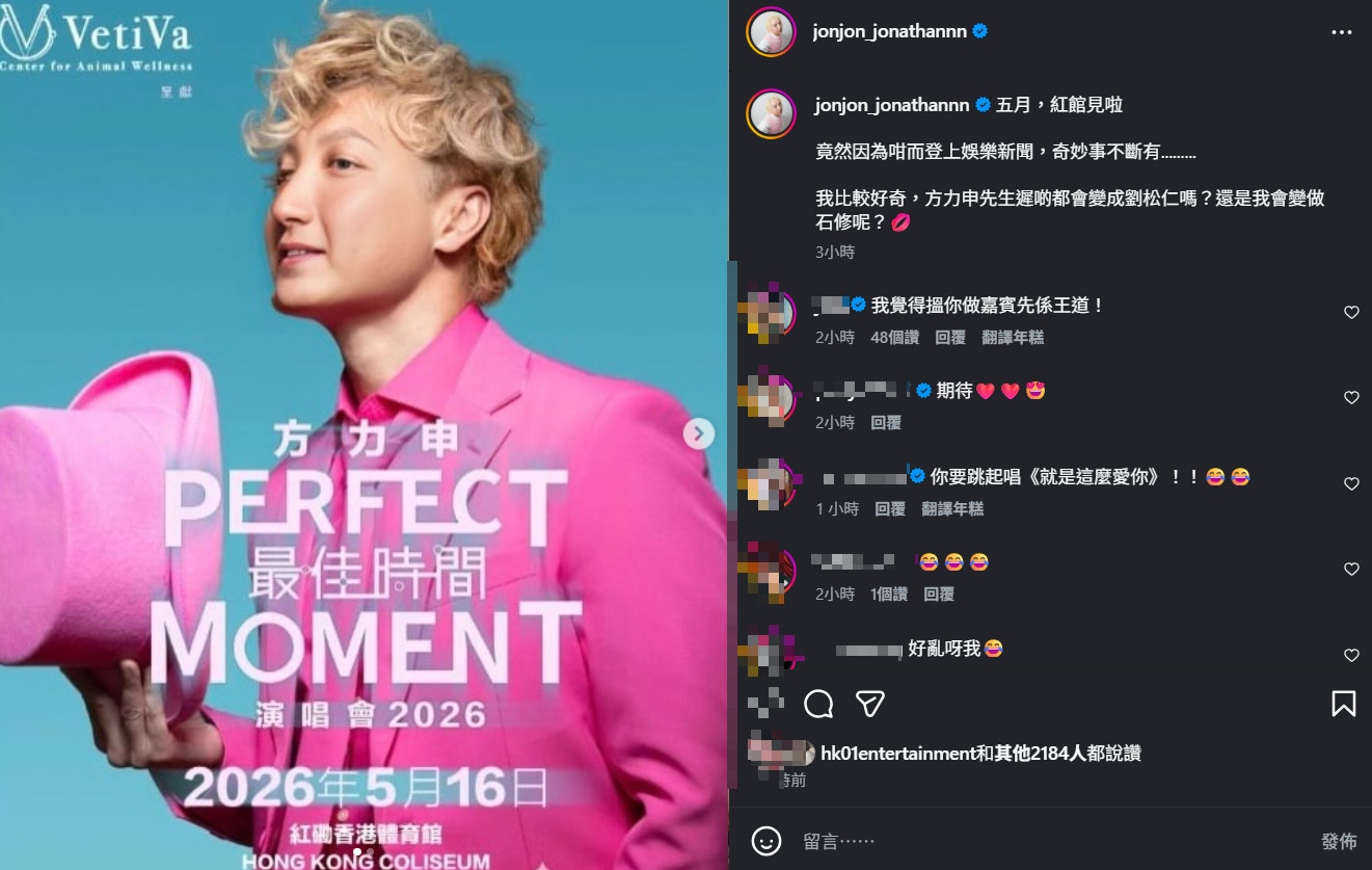 剛於前日(26日)迎來46歲生日的方力申(小方)可謂喜事重重!有女萬事足的他,除了在社交平台晒出溫馨父女合照,宣布愛女中文名為「方愛嘉」並許下健康快樂的生日願望外,更為苦候多年的歌迷送上驚喜大禮——宣布將於5月16日舉行人生首個紅館個唱《方力申最佳時間演唱會2026》。不過,演唱會海報一出卻惹來抄襲疑雲,除了被指與尹光去年的個唱海報極度相似之外,其破格的金髮造型更意外撞樣YouTuber Jon Jon,引起網民熱烈討論。