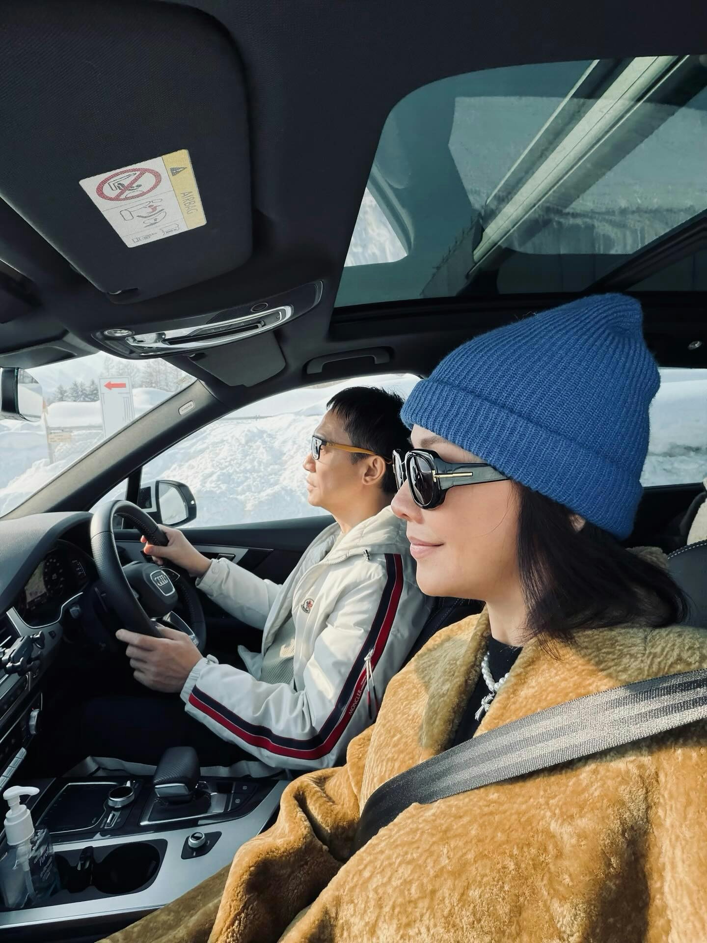 從嘉玲姐分享的照片可見,兩人身處一輛行駛中的汽車內,背景是白雪皚皚的北國風光,氣氛浪漫。(IG@carinalau1208)