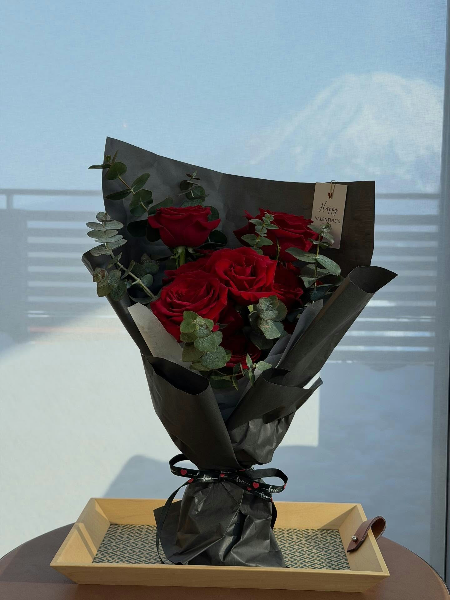除了合照,嘉玲姐還貼出一張紅玫瑰花束的特寫照,花束以簡約高級的黑色花紙包裹,附上一張寫著「Happy Valentine's」的心意卡,,相信是由「跟得老公」梁朝偉送上的心意。