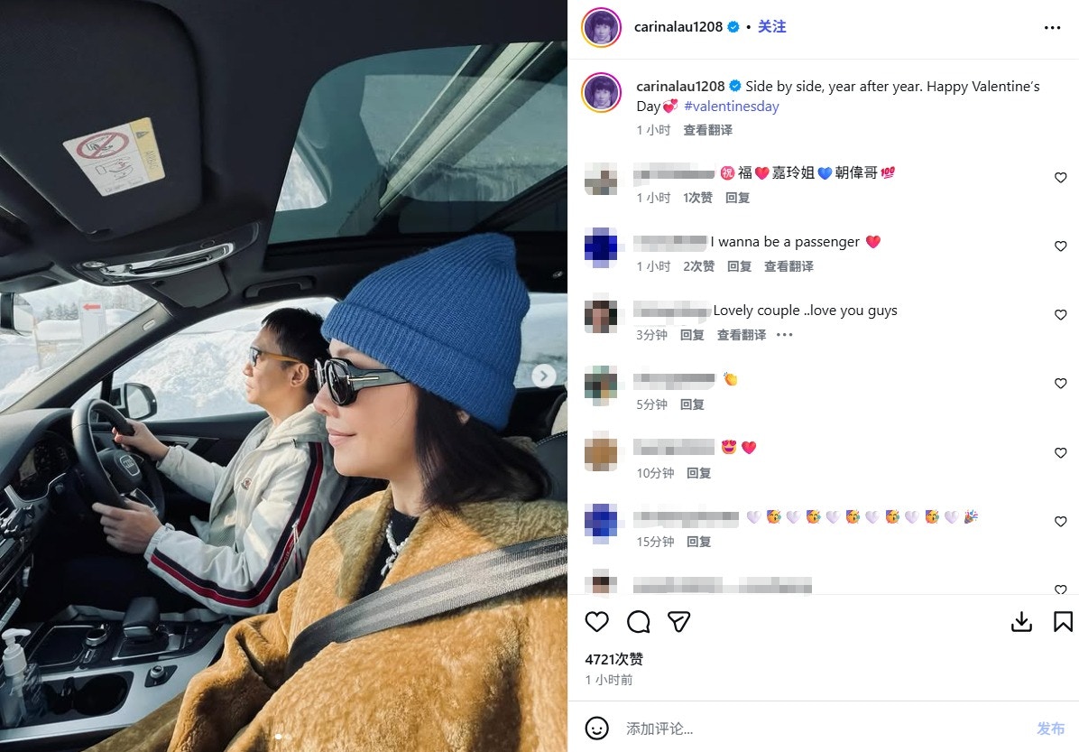 今日(2月14日)適逢西方情人節,全城彌漫戀愛氣氛,不少藝人都趁機在網上放閃。劉嘉玲亦不例外,從嘉玲姐分享的照片可見,兩人身處一輛行駛中的汽車內,背景是白雪皚皚的北國風光,氣氛浪漫。身穿大衣、戴著鮮藍色冷帽及太陽眼鏡的嘉玲姐坐在副駕駛座,望向窗外露出淺淺甜笑;而身旁的梁朝偉則身穿白色型格外套,戴著黑超專注駕駛。