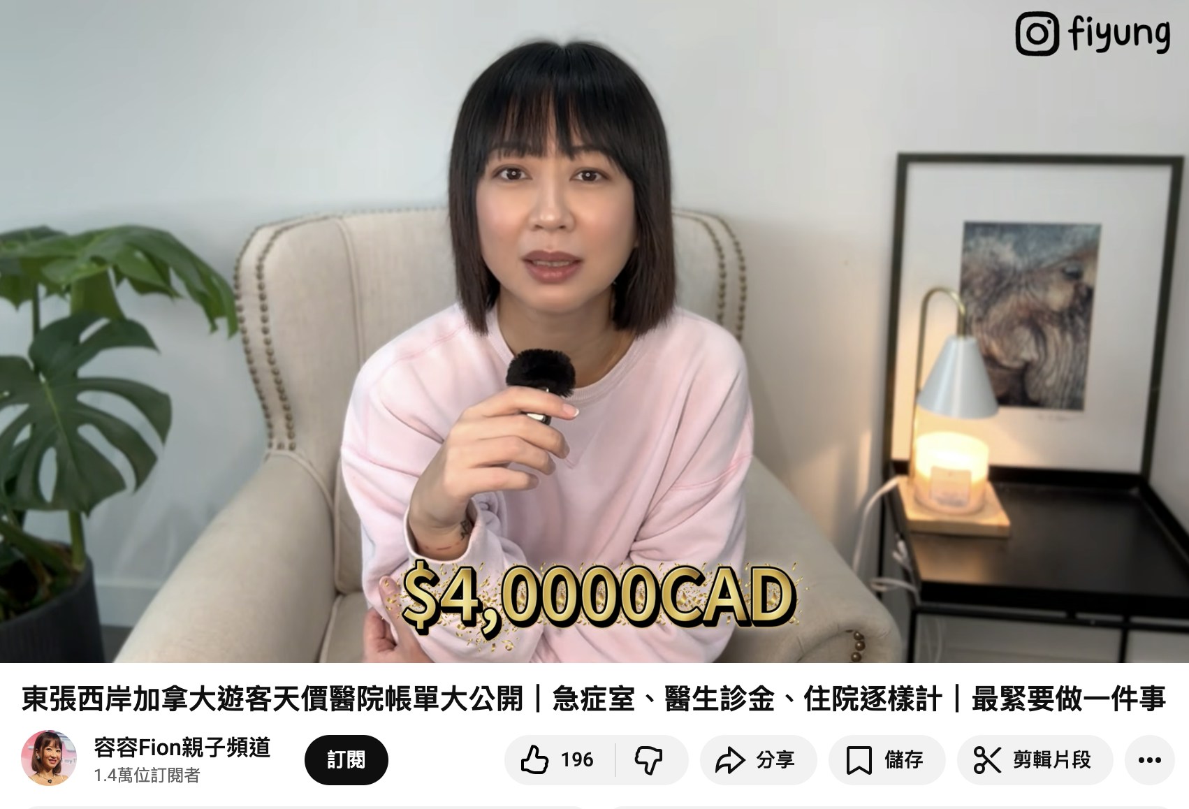 雖然治療過程順利,但隨之而來的賬單卻令容羨媛大為震驚。她詳細列出開支清單,單是急症室登記費已需1320加幣(約7551港元),住院費不含藥費與檢查費,「每一日(住院)都需要4200蚊嘅加幣(約24027港元)。」。由於加拿大實行醫生、醫院分家制度,醫生費需另計,包括緊急治療費1980加幣(約11327港元),以及「每一日醫生嚟巡房,都係需要再畀150蚊加幣(約858港元)。」容羨媛指,最終埋單總計約4萬加幣,折合港幣約22.8萬元。