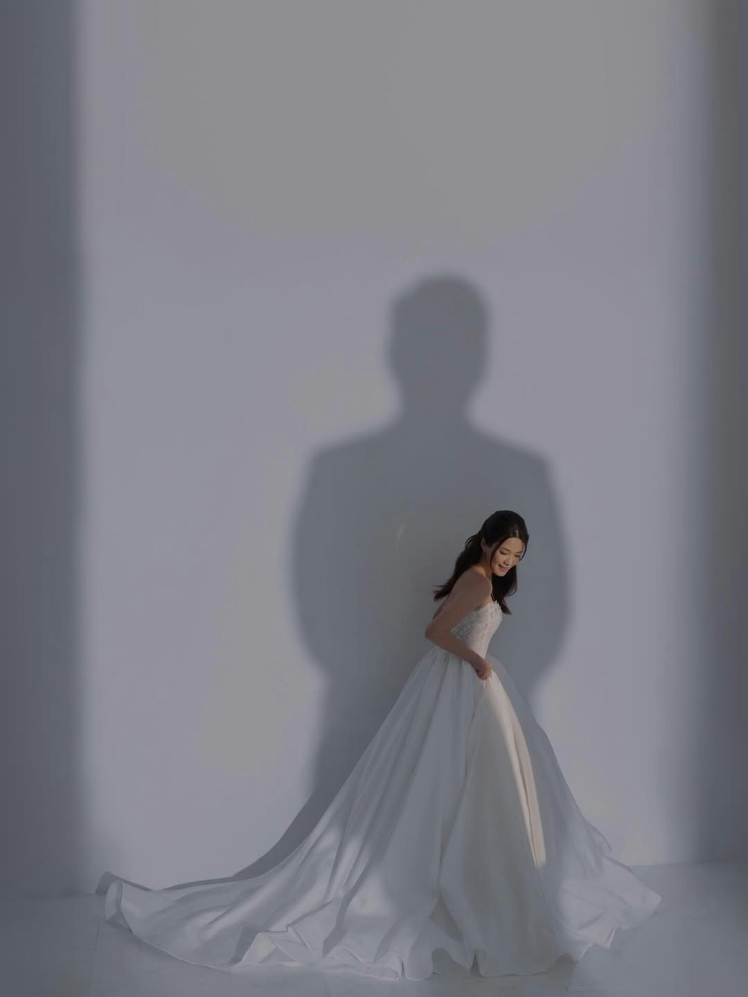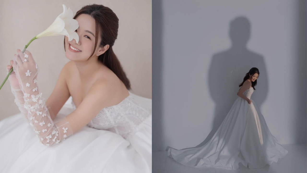 今日(14日)是情人節,社交平台充滿粉紅泡泡,前TVB花旦江嘉敏亦趁熱鬧,在Instagram發布一系列唯美婚紗照,相中她身穿簡潔典雅的露肩緞面婚紗,手持白色馬蹄蓮大曬閃亮鑽戒,對著鏡頭甜笑,幸福感滿瀉。其中一張照片最令人關注,見江嘉敏站在一道牆邊,身後投射出一個高大的男性「黑影」,營造出「愛的視角」,令外界紛紛猜測她是否終於搵到Mr. Right,準備封盤做人妻?