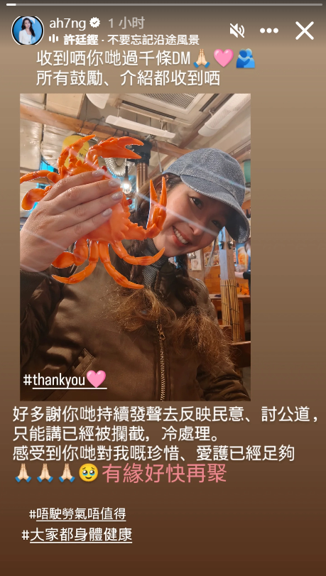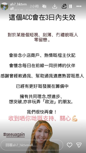 阿七今日(12日)再次發限時動態,感謝粉絲給她的支持、鼓勵及介紹新工作,但無奈表示大家為她發聲、反映民意的結果可能不盡如人意:「收到晒你哋過千條DM,所有鼓勵、介紹都收到晒;好多謝你哋持續發聲去反映民意、討公道,只能講已經被攔截、冷處理,感受到你哋對我嘅珍惜、愛護已經足夠,有緣好快再聚 #唔使勞氣唔值得 #大家都身體健康。」