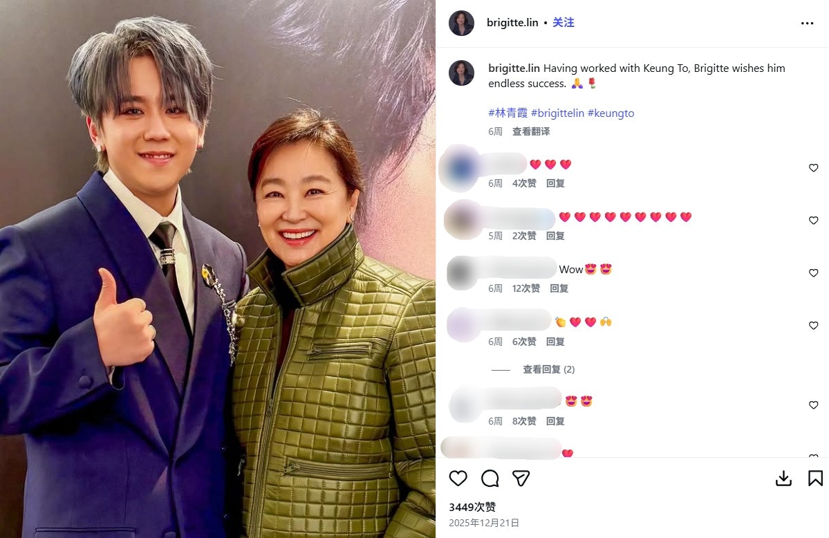 事後,她更在社交平台上載了與姜濤的合照,並以英文留言送上祝福:「Having worked with Keung To, Brigitte wishes him endless success.」盡顯前輩風範。事實上,兩人的緣分早有跡可尋,在此前的一場慈善晚宴中,林青霞曾特意點名與姜濤合唱張國榮的經典金曲《明星》,兩人因此而結緣。這段跨越世代的「忘年交」情誼,一直為人津津樂道。