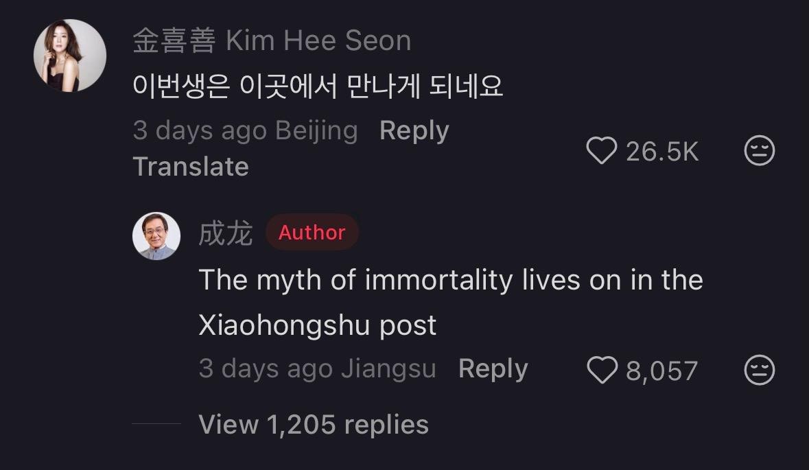 開設小紅書後,不少與成龍合作過的中國演員均留言表示歡迎,包括《捕風追影》團隊的此沙、文俊輝、林秋楠等後輩。其中,更驚喜地有成龍曾於《神話》合作過的「黎明舊愛」金喜善以韓文留言相認,表示:「這次人生在這裡相遇了!」成龍亦回覆指:「不朽的神話在小紅書中延續。」呼應20年前合作的跨時空魔幻動作電影。