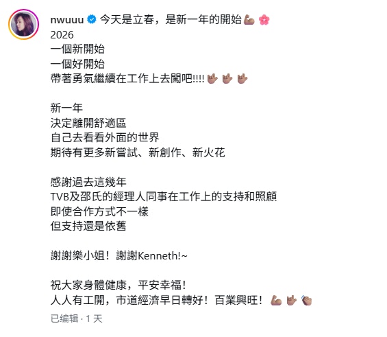 兩屆TVB「視后」胡定欣(Nancy)趁著「立春」(2月4日)這個象徵新開始的日子,於社交網投下「震撼彈」,正式宣布已約滿離巢。(IG@nwuuu)