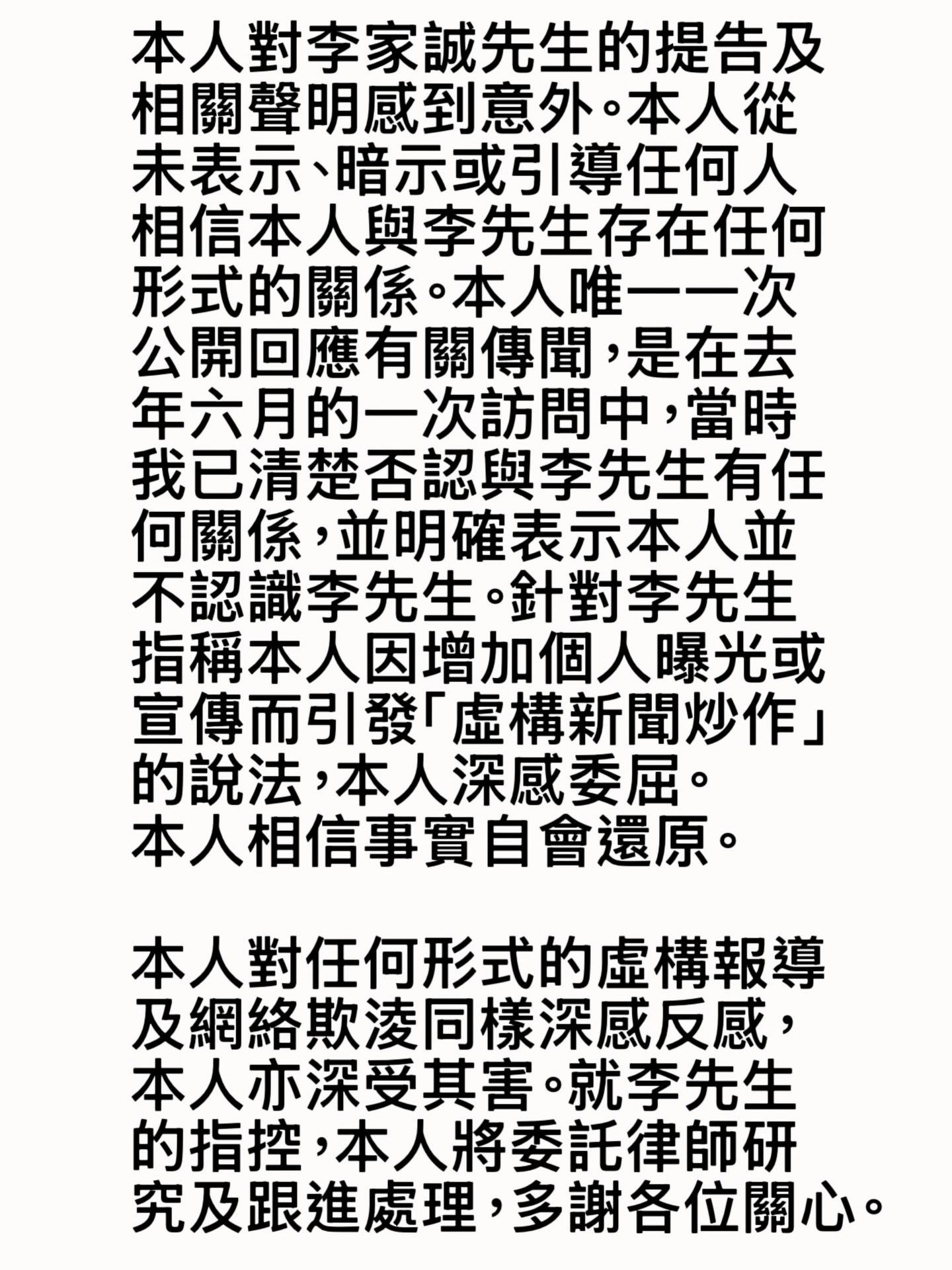 本人對李家誠先生的提告及相關聲明感到意外。本人從未表示、暗示或引導任何人相信本人與李先生存在任何形式的關係。本人唯一一次公開回應有關傳聞,是在去年六月的一次訪問中,當時我已清楚否認與李先生有任何關係,並明確表示本人並不認識李先生。針對李先生指稱本人因增加個人曝光或宣傳而引發「虛構新聞炒作」的說法,本人深感委屈。