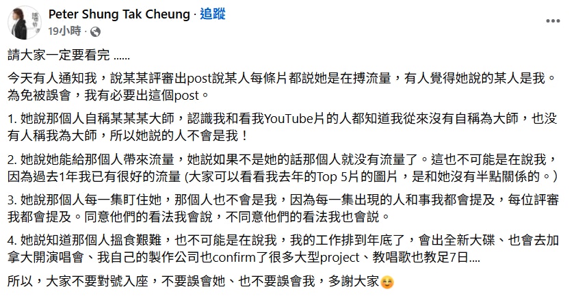 張崇德的四點澄清並未獲網民認同,有網民直言「有參賽者都話覺得張生別有用心,係專登針對谷小姐。所以公道自在人心。證明其實好多人都睇得出」,更指其將反對自己的留言九成刪除,搞一言堂,並呼籲網民到其他 KOL 平台留言,讓真相被更多人看見。