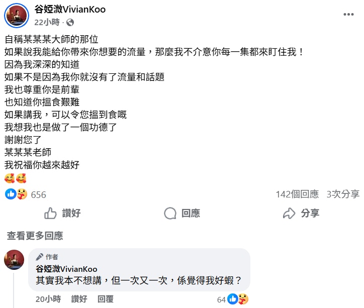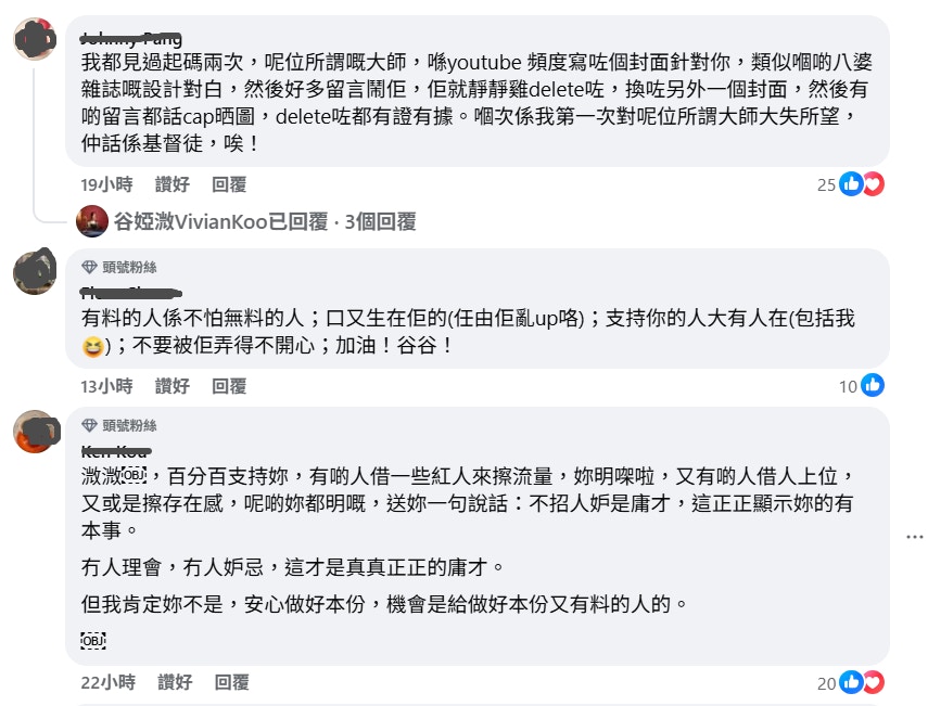 谷婭溦的帖文隨即引來大批網民留言討論,大批網民留言點名猜測該「大師」就是張崇德,有人直言:「大家都知係邊個啦,係咪姓張嗰位?」更有人細數證據指證:「我都見過起碼兩次,呢位所謂嘅大師,喺 youtube 頻道寫咗個封面針對你,類似嗰啲八婆雜誌嘅設計對白,然後好多留言鬧佢,佢就靜靜雞 delete 咗,換咗另外一個封面,然後有啲留言都話 cap 晒圖,delete 咗都有證有據。」更有網民不滿其風格,留言力撐溦溦:「呢位某某某扮到好中立,其實集集都帶方向誤導人,其心可誅!」直指對方的評論存在偏見。