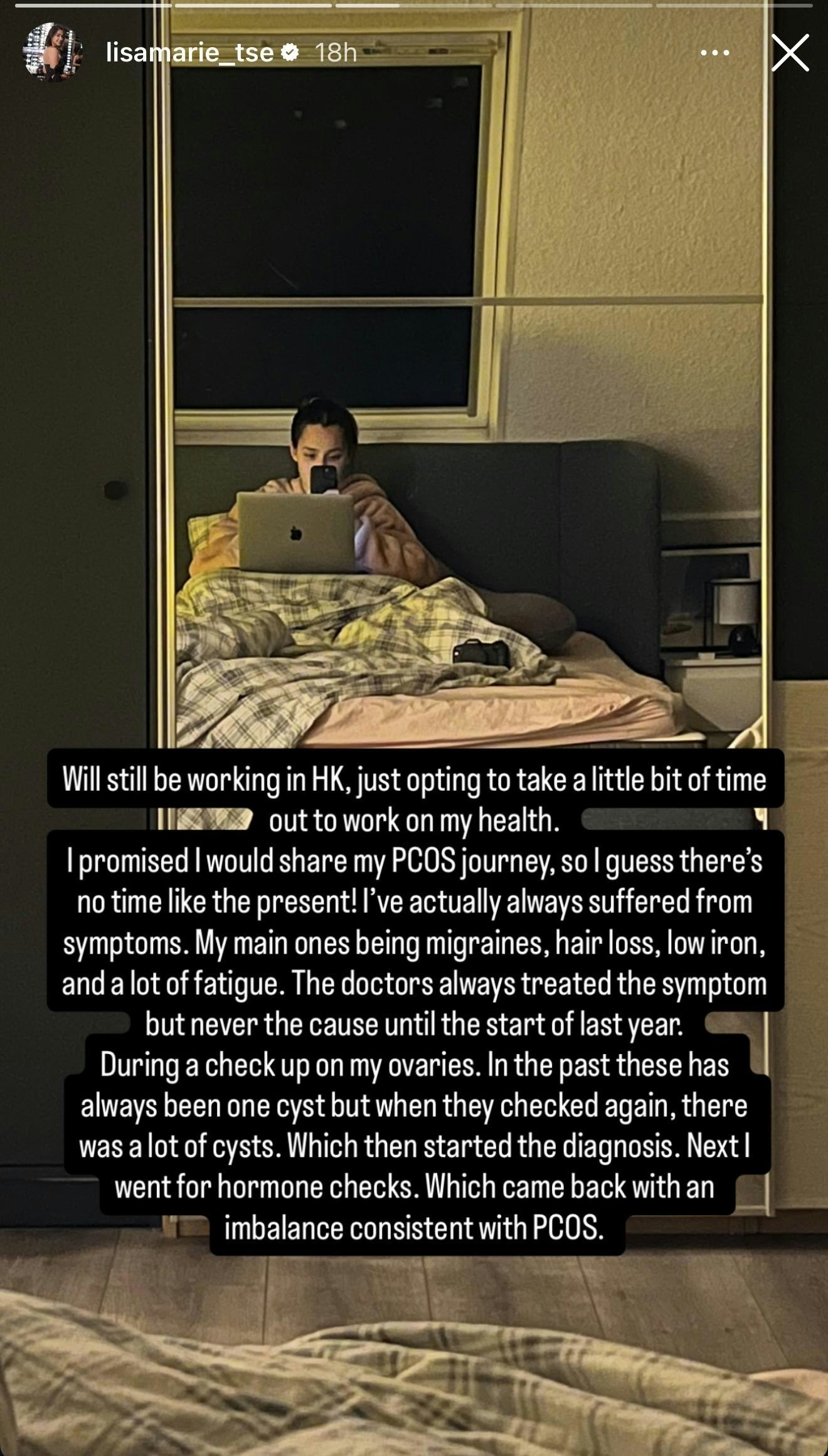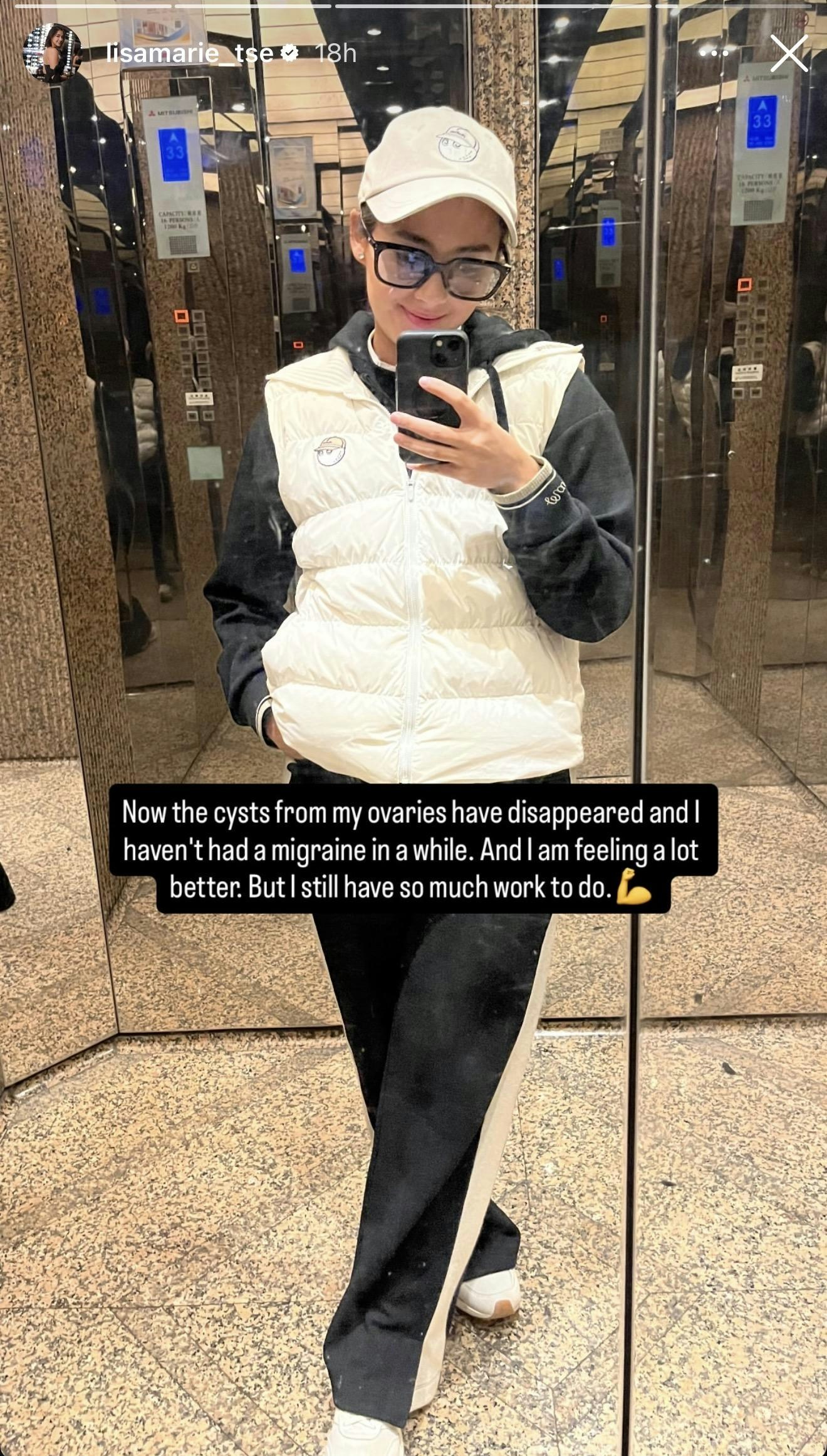 謝嘉怡透露其卵巢囊腫已消失,也有一段時間沒有偏頭痛,感覺好了很多。(IG@lisamarie_tse)