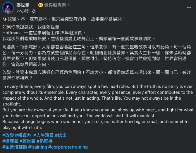 「細龍生」在劇集中性格火爆,更喜歡踢垃圾桶,不過現實中卻完全不同。有網民在留言區中大爆鄭世豪為人友善,並透露:「他人很友善呢。我過去拍照他還幫我拿手機。」另外,鄭世豪離巢後轉行成為企業培訓師,自去年起已為超過三千人提供培訓。