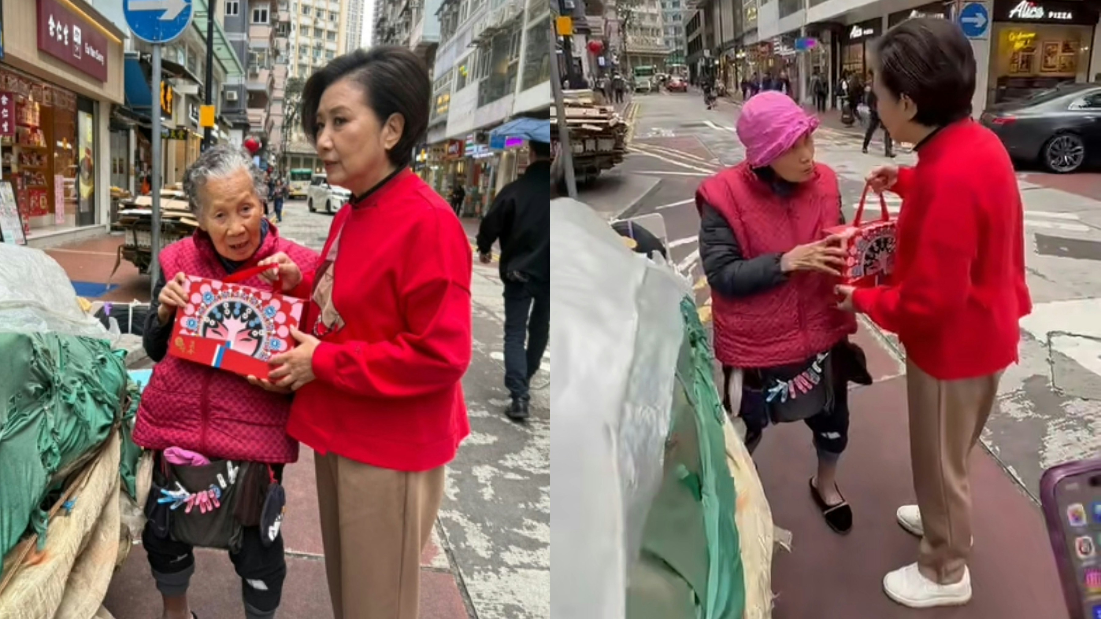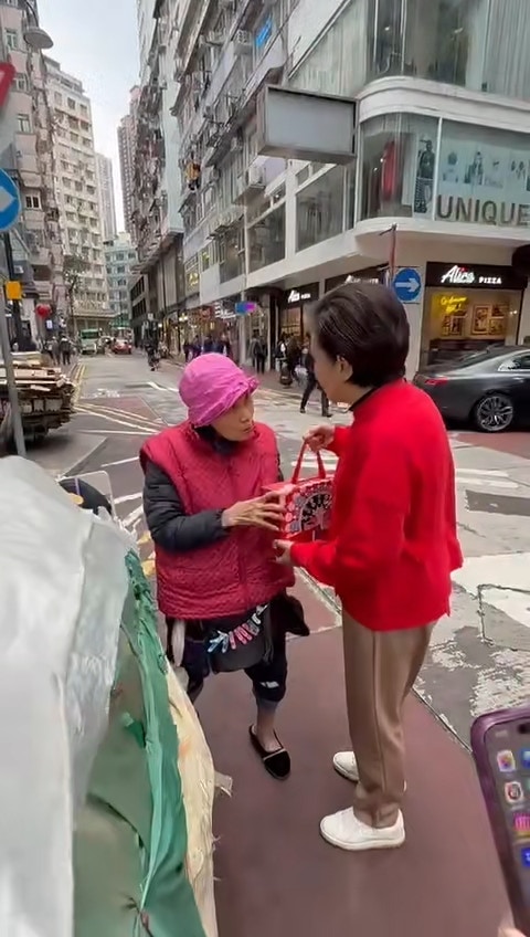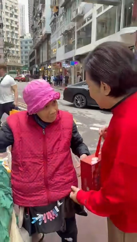 身穿紅色上衣的汪明荃手持一個賀年蘿蔔糕禮盒,走到一位型瘦削矮小的年老女小販「玉姐」身旁。(小紅書)