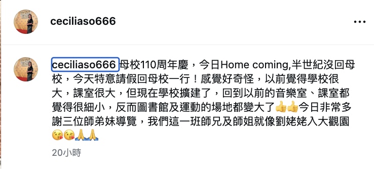 蘇恩磁相隔半世紀後重回母校探訪。(IG@ceciliaso666)