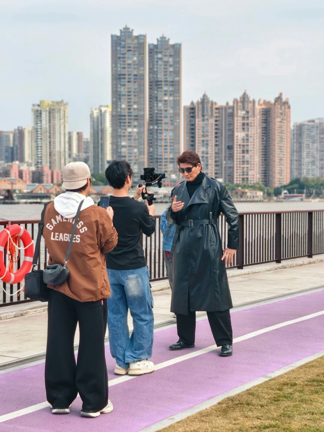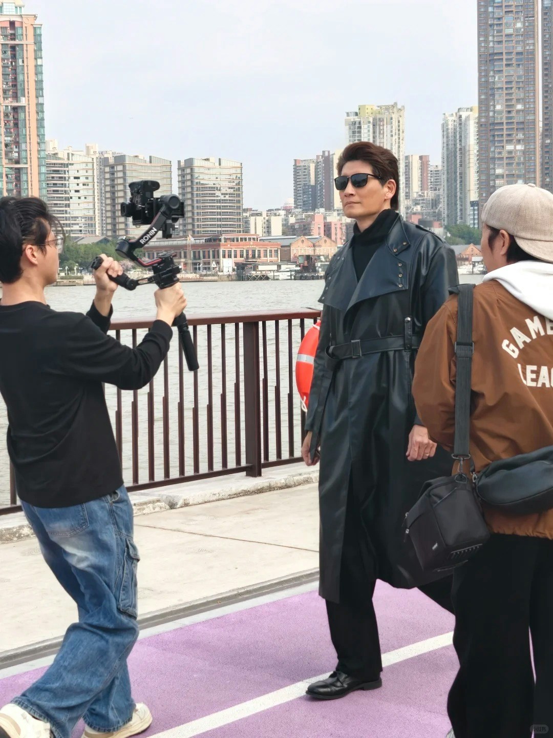袁文傑一身「黑客帝國」造型行走在街頭進行拍攝,型到裂。(小紅書圖片)