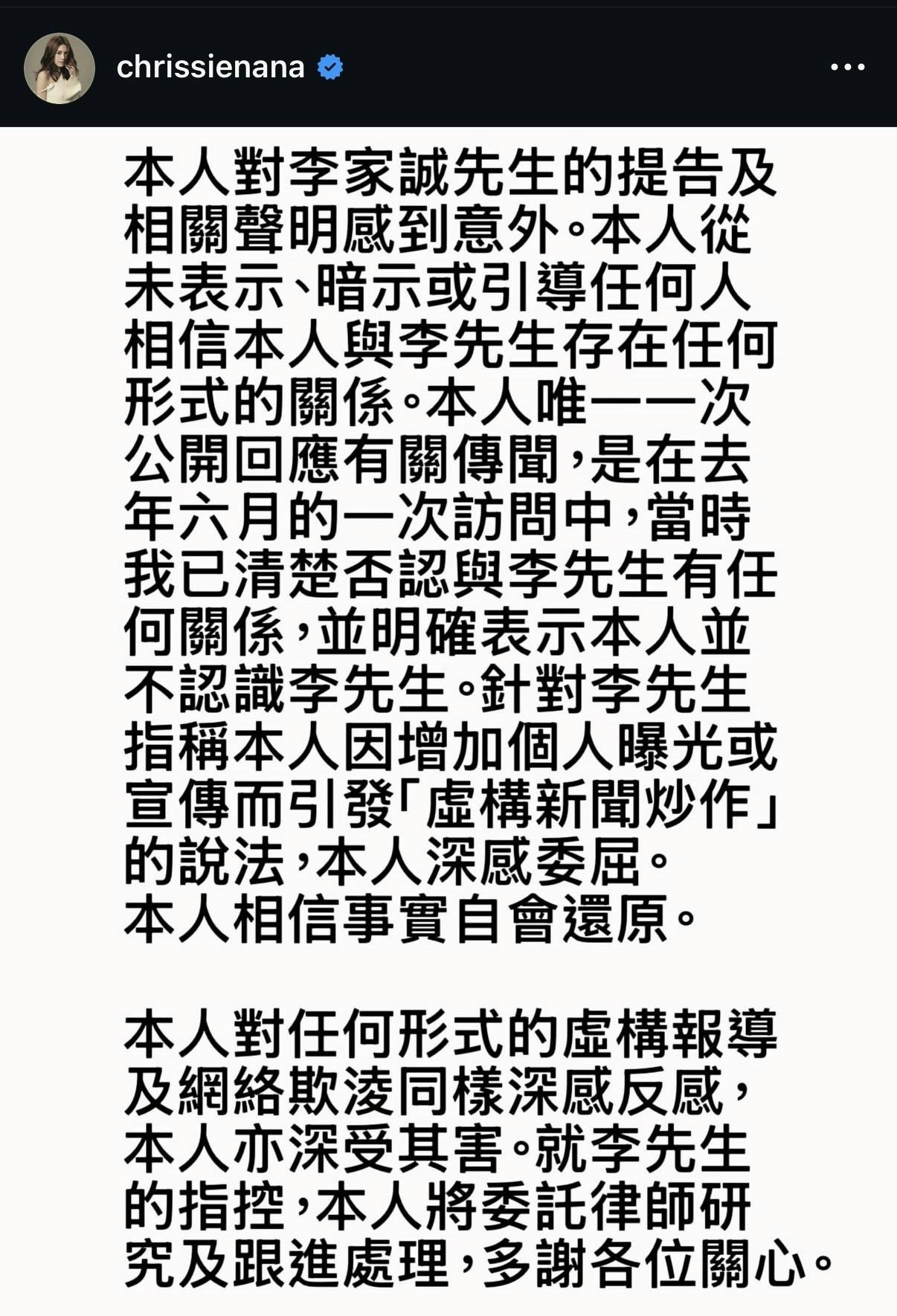 本人對李家誠先生的提告及相關聲明感到意外。本人從未表示、暗示或引導任何人相信本人與李先生存在任何形式的關係。本人唯一一次公開回應有關傳聞,是在去年六月的一次訪問中,當時我已清楚否認與李先生有任何關係,並明確表示本人並不認識李先生。針對李先生指稱本人因增加個人曝光或宣傳而引發「虛構新聞炒作」的說法,本人深感委屈。