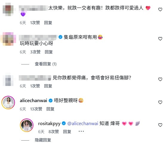 這段「滑雪受難記」影片曝光後,立即引來大批網民及圈中好友圍觀。不少粉絲睇見郭柏妍跌得這麼應,既被她跌倒的傻氣逗樂,同時亦感到十分心疼,紛紛留言:「見你跌都覺得痛」、「玩時要小心呀」。就連好前輩、女星陳煒(煒哥)都忍不住留言送上關心,擔心地叮囑:「唔好整親呀!」可見郭柏妍在圈中人緣甚佳,大家都希望她下次能順利滑行,不用再「懷疑人生」。