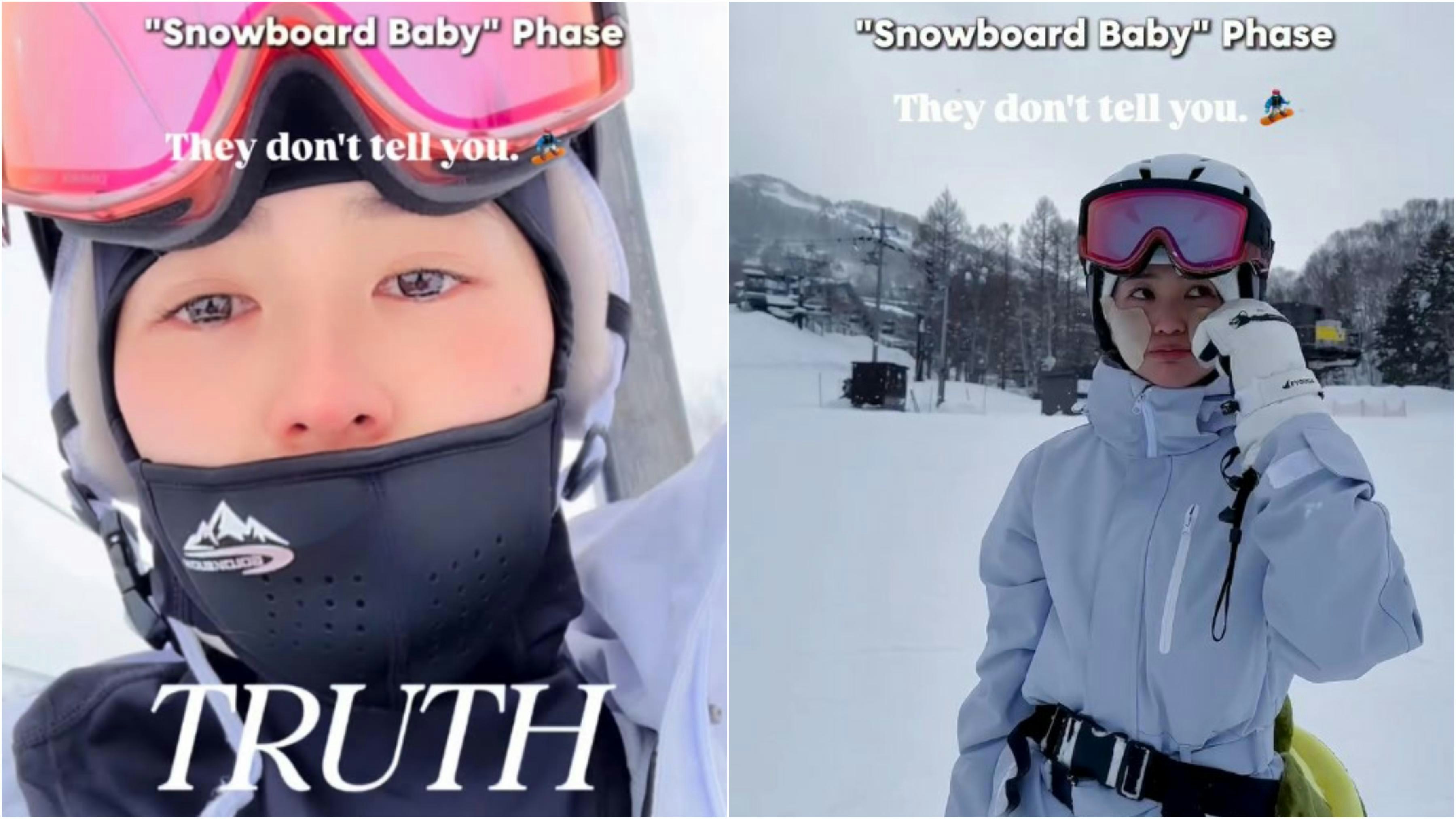 然而,理想很豐滿,現實卻很骨感。鏡頭一轉,畫風突變!郭柏妍一踏上雪地就由女神變成了「滾地葫蘆」。影片中見她接二連三地失平衡狠狠摔倒,即使有烏龜墊護體,依然跌得「好甘」。其中一幕最令人心痛,郭柏妍站在雪地裏,雙眼通紅含著淚水,面露痛苦表情,一副「我是誰?我係邊?」的懷疑人生模樣。