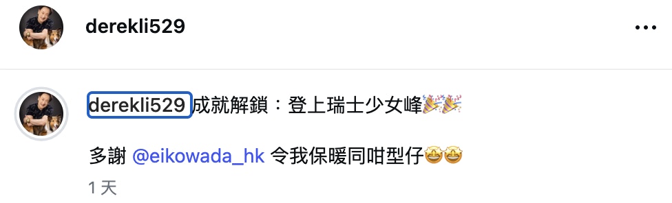 李浩林近日到了瑞士,遠赴當地自然要一試登上少女峰的滋味。李浩林先在觀景台拍照,準備定裝備,成功登上瑞士少女峰。他穿上厚厚的雪衣,坐在雪地上興奮地拍照,後面側插有一支國旗。李浩林發文:「成就解鎖:登上瑞士少女峰」。