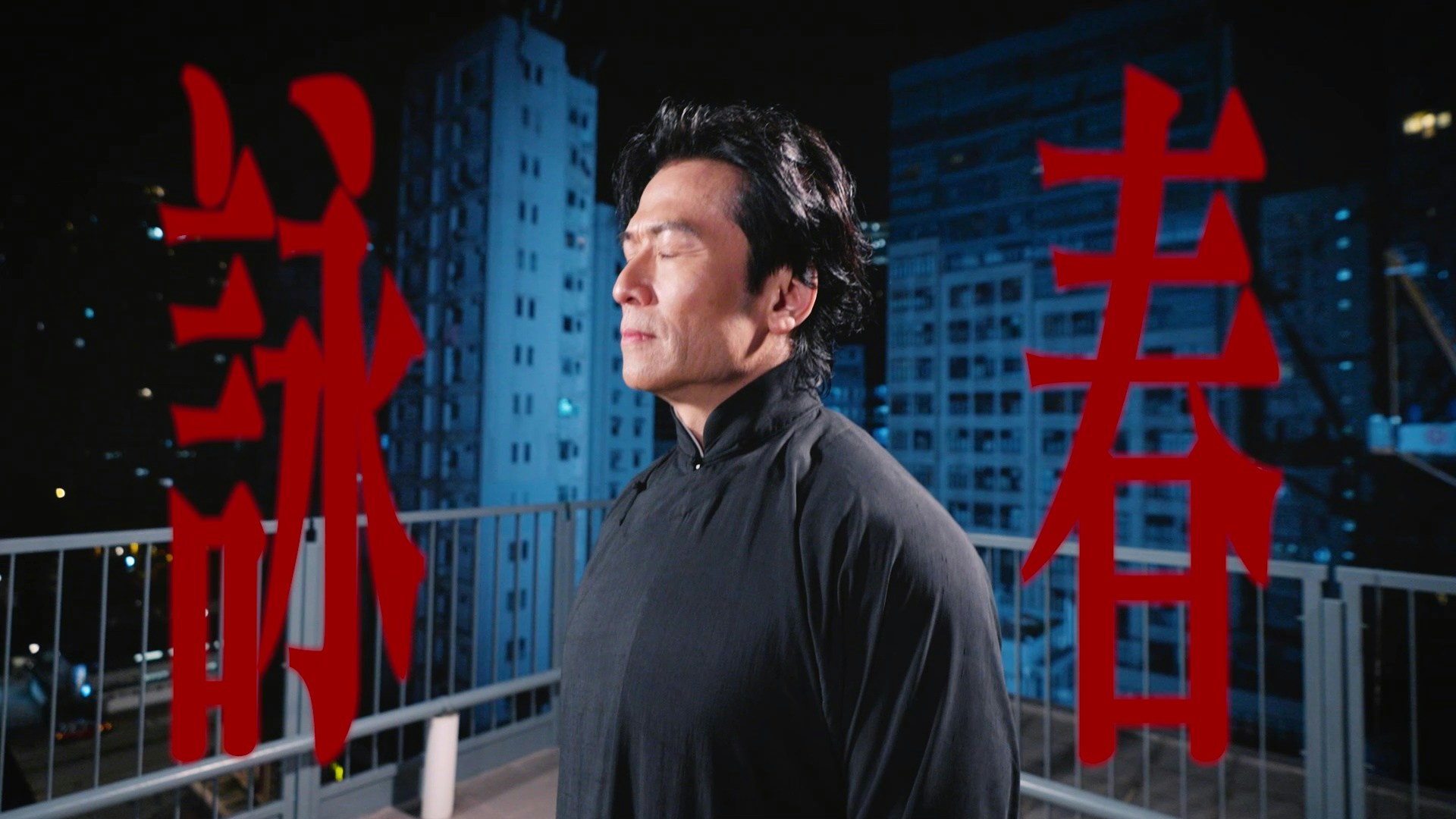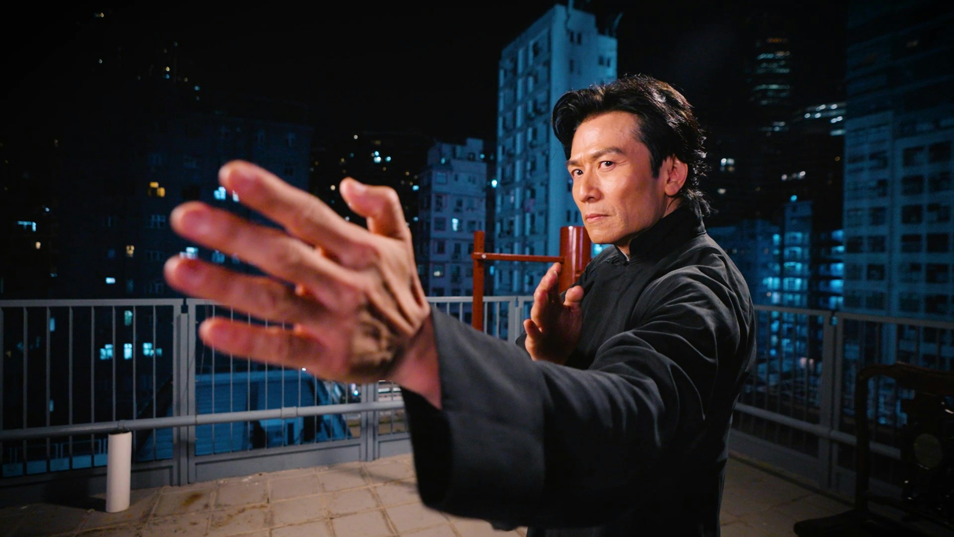 知名詠春高手唐文龍穿起唐裝在大廈天台大晒詠春功架。(官方提供圖片)