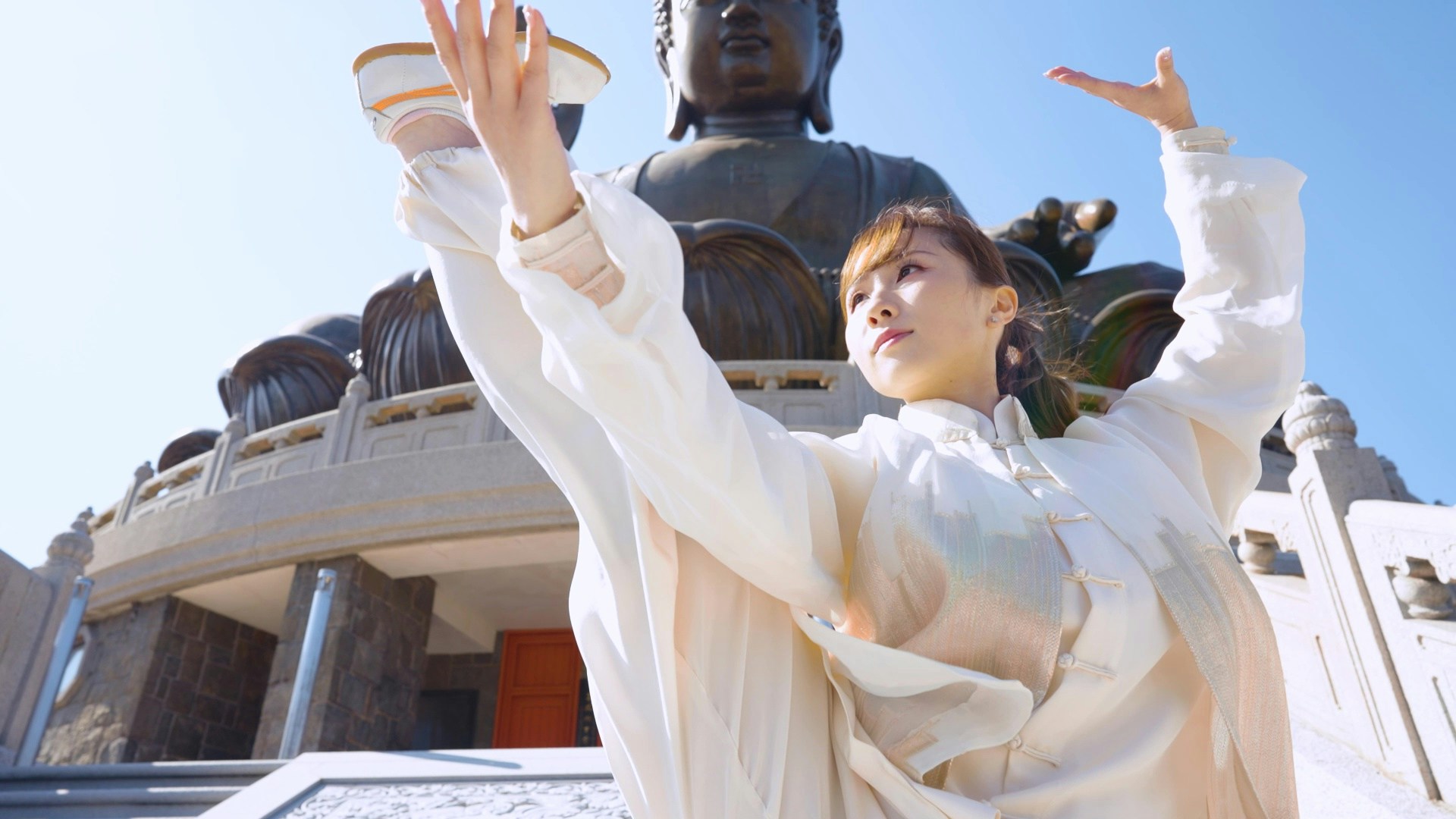 除了唐文龍,中國香港武術運動員莫宛螢在天壇大佛前耍的太極亦絕對賞心悅目,萬勿錯過。