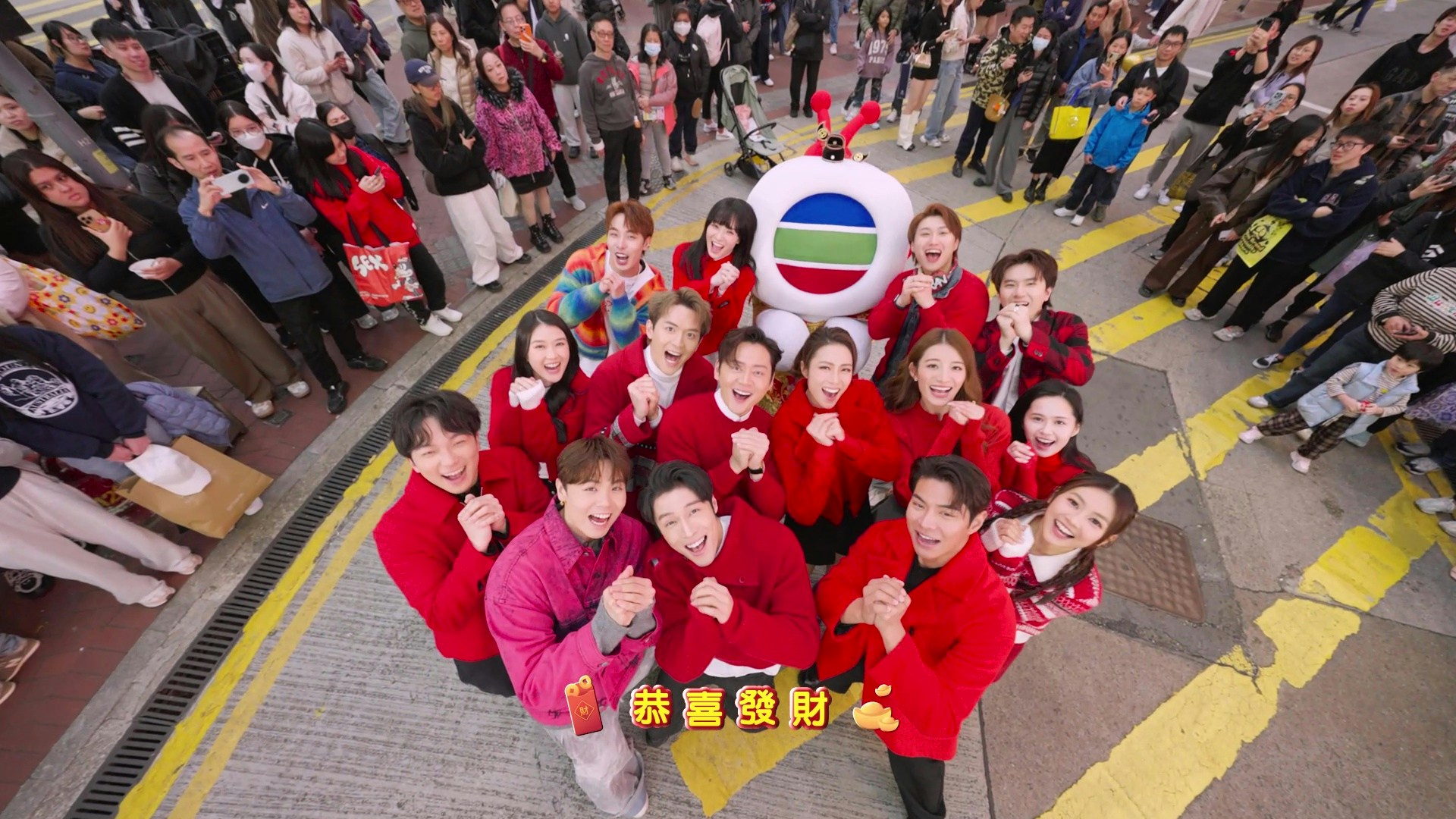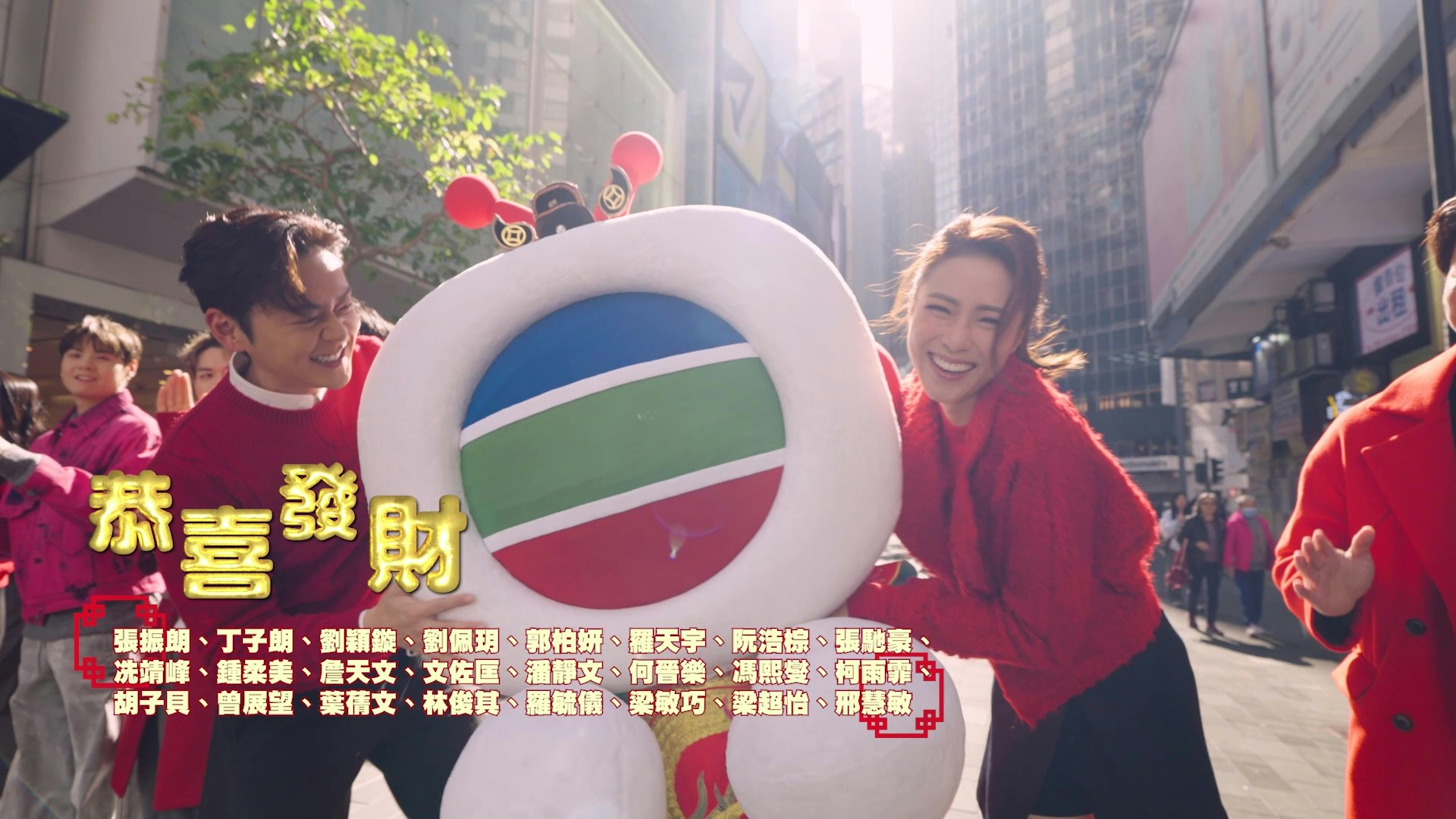 張振朗、劉穎鏇、及財神TVBuddy率領一眾上位小生及花旦在鬧市高歌《恭喜發財》。(官方提供圖片)