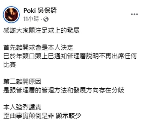 保錡發文說:「離開球會是本人決定,於年頭口頭上巳通知管理層說明不再出席任何比賽,第二離開原因是跟管理層的管理方法和發展方向存在分歧,本人強烈譴責歪曲事實顛倒是非。」(fb@k_p0k1)