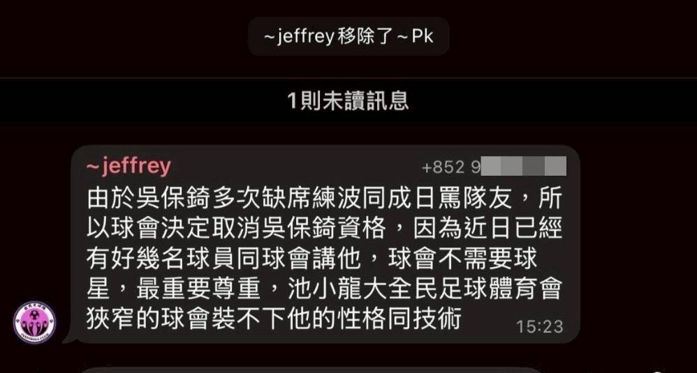 有疑似球會內部群組的對話截圖,內容亦流露出不滿指:「由於吳保錡多次缺席練波同成日罵隊友,所以球會決定取消吳保錡資格,因為近日已經有好幾名球員同球會講他,球會不需要球星,最重要尊重,池小龍大全民足球體育會狹窄的球會裝不下他的性格同技術。」
