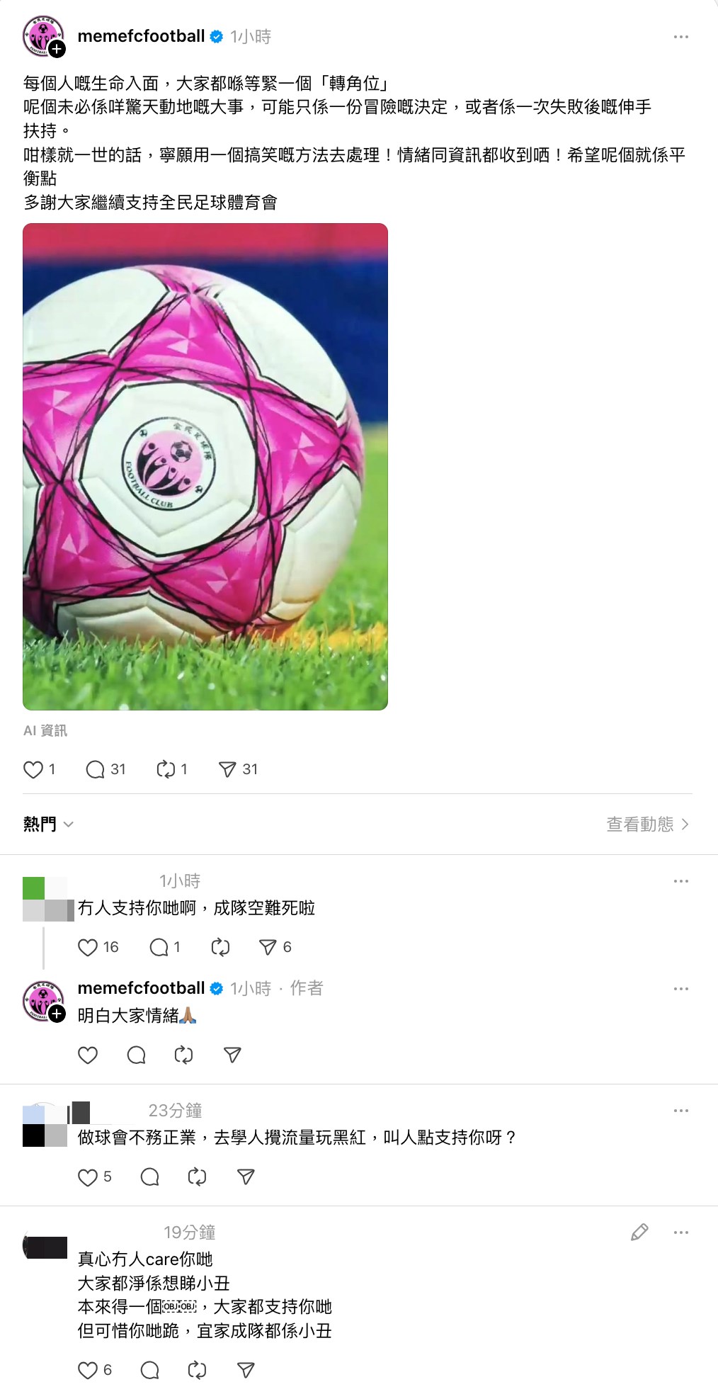 全民足球體育會見群情洶湧即刪文,球會今午再出post:「每個人嘅生命入面,大家都喺等緊一個『轉角位』,呢個未必係咩驚天動地嘅大事,可能只係一份冒險嘅決定,或者係一次失敗後嘅伸手扶持。咁樣就一世的話,寧願用一個搞笑嘅方法去處理!」結果仍難平息網民怒火。(Threads@memefcfoootball)