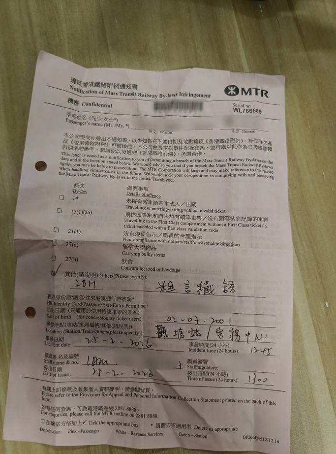 樓主分享由港鐵於2月25日下午1時左右發出的「違反香港鐵路附例通知書」,列明他在觀塘站違反《港鐵附例》第28H條「粗言穢語」,「港鐵會將本次事件記錄在安,並可能作為日後處理類似個案的參考」。