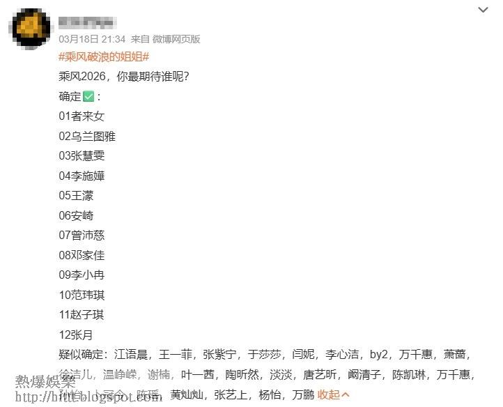 值得一提的是,最新一份《浪姐7》參賽名單被曝光後,就有網民在留言區詢問:「說好的張曼玉呢?」原來在《浪姐7》節目籌備初期,網上就瘋傳張曼玉、王祖賢及韓國女星宋慧喬等巨星將會參加的名單,並言之鑿鑿地表示「已出機票」的消息,一度引起粉絲轟動。但隨著時間流逝,以及新名單的傳出,實際成事的可能性微乎其微。