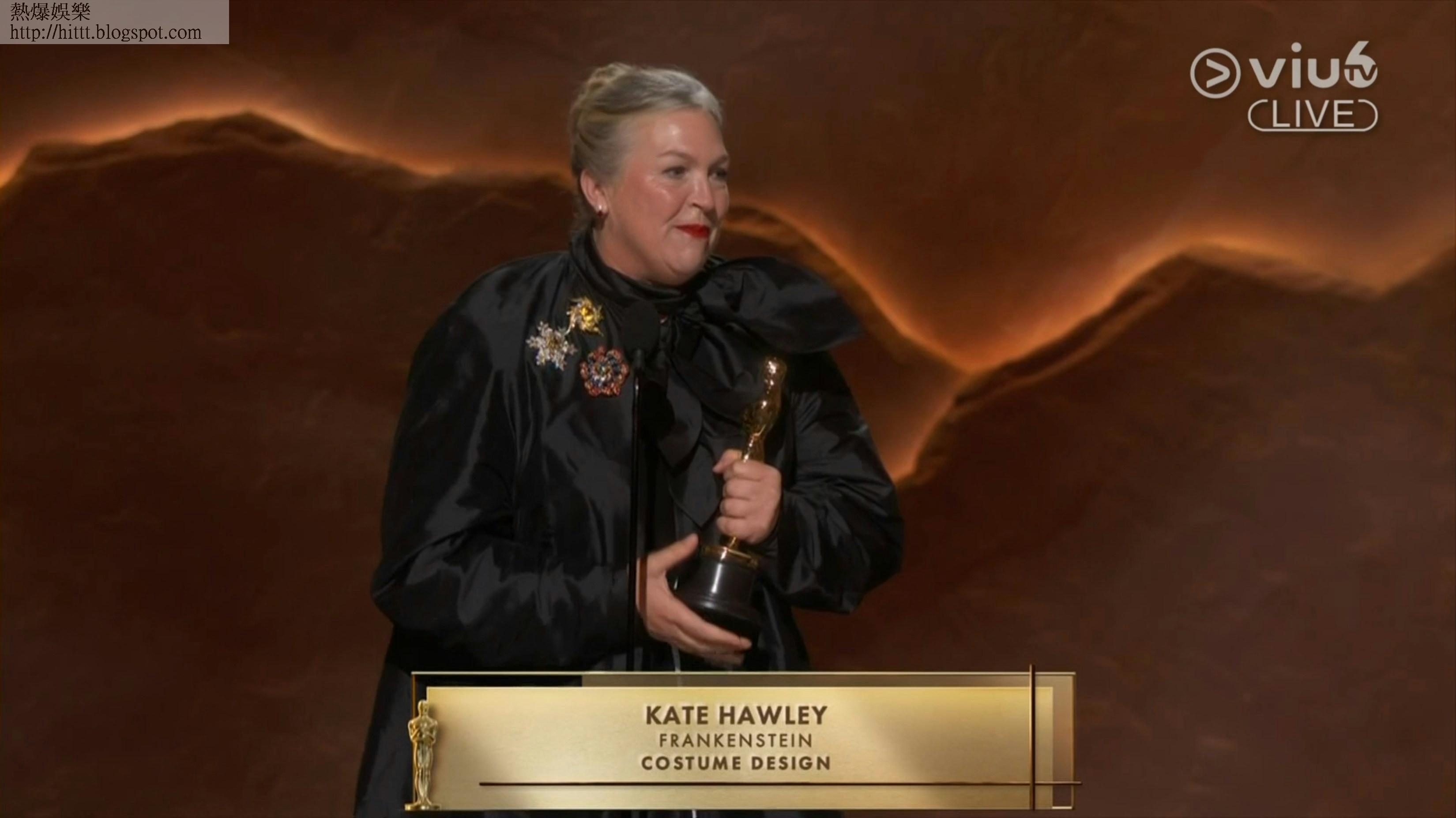 Kate Hawley憑《科學怪人》獲頒「最佳服裝設計」。(直播畫面)