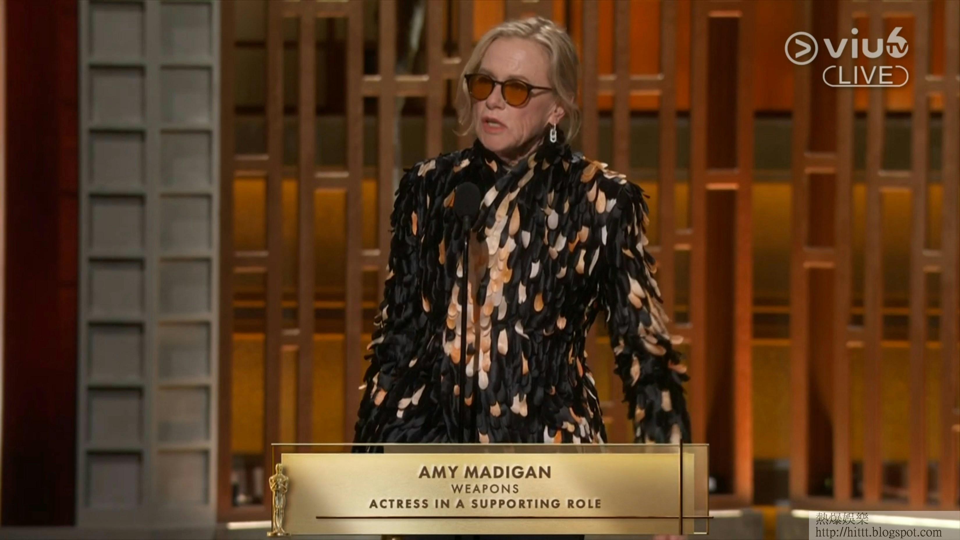 Amy Madigan憑《凶器》奪得「最佳女配角」。(直播畫面) 07:00 典禮正式開始,今年由Conan O'Brien擔任主持人。