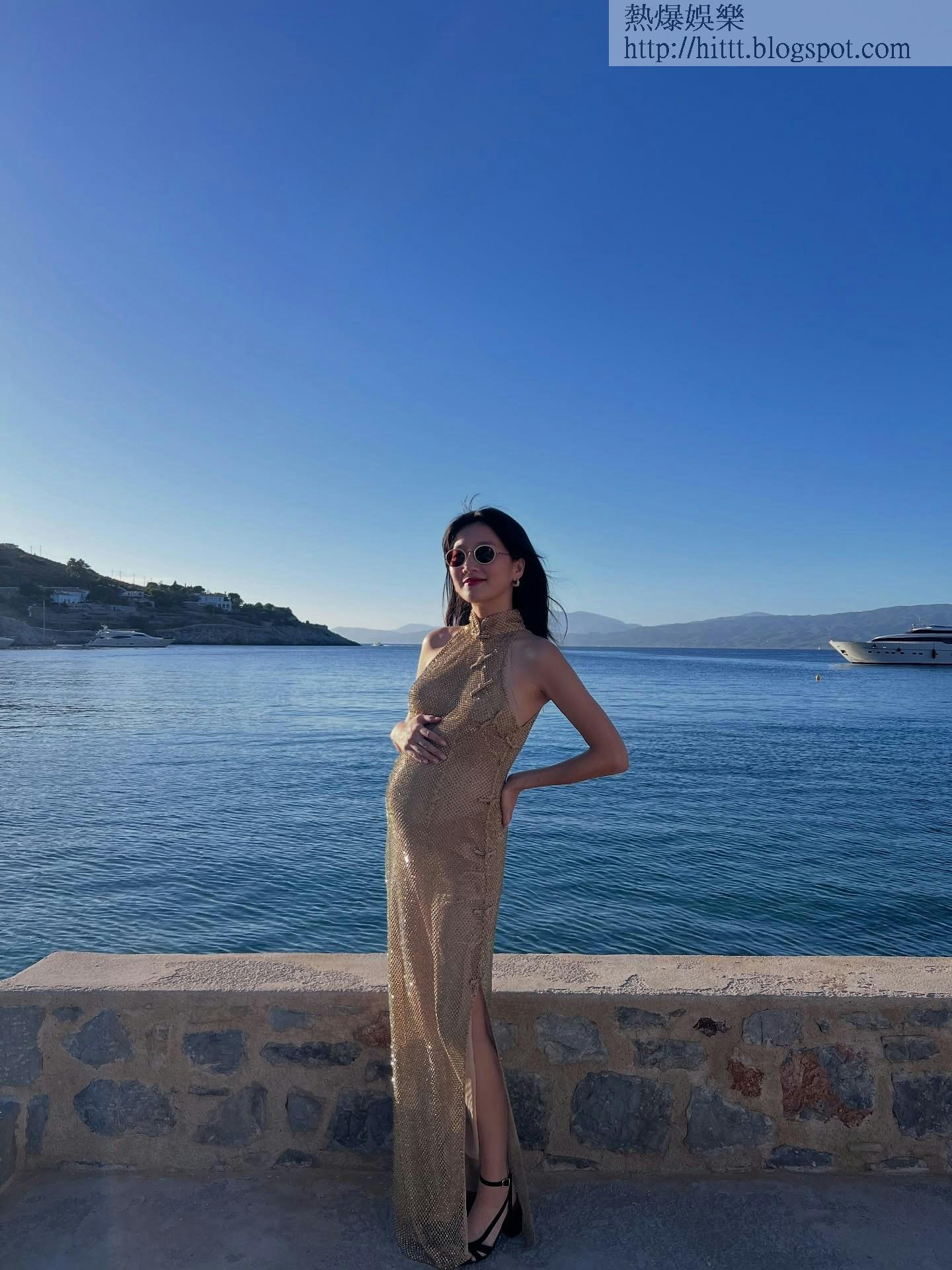 身穿金色高衩長裙的鄭瑤輕撫孕肚,一臉幸福。(IG@zanetacheng)