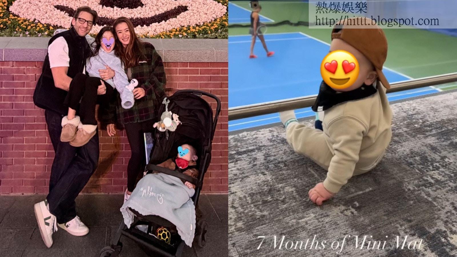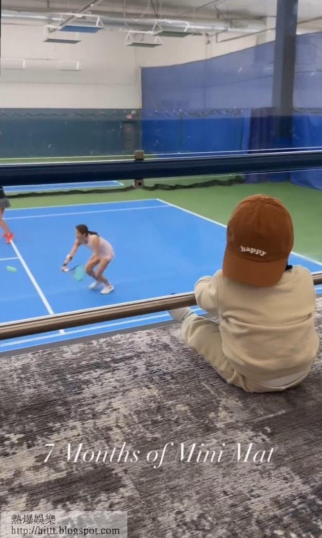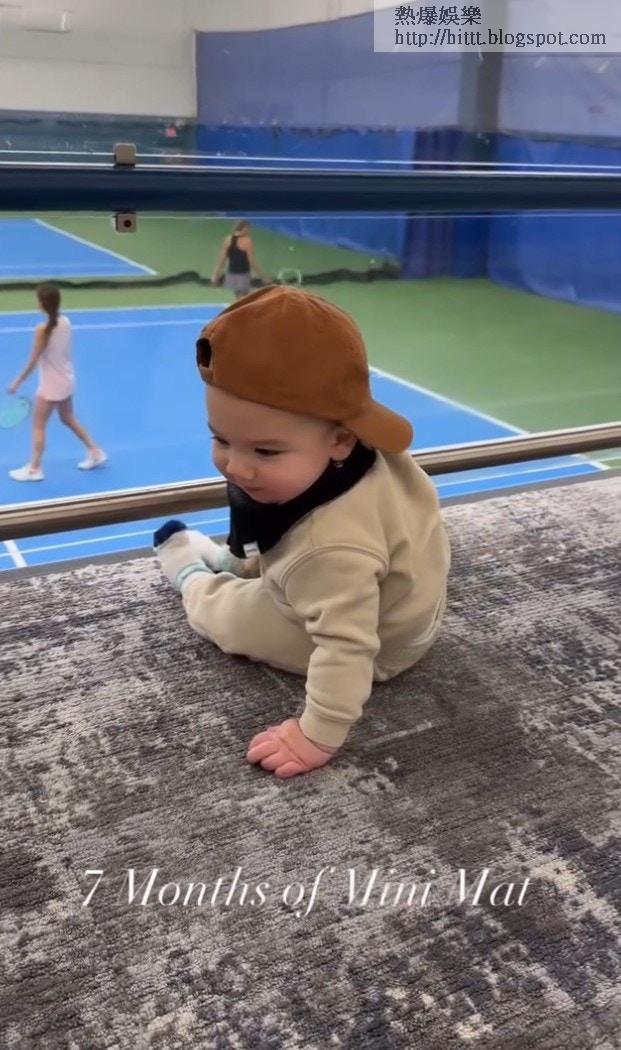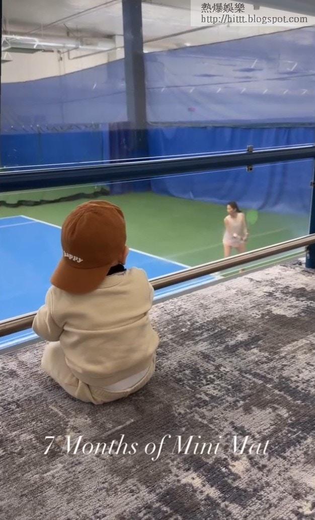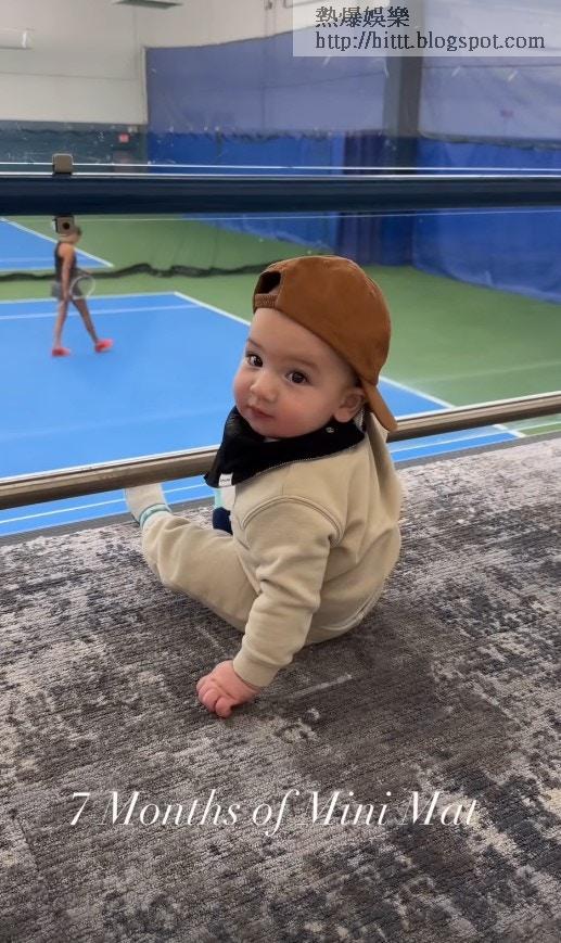 Mathew寫道:「7 months of Mini Mat.」片中所見,BB戴上Cap帽坐在地氈上,認真地看着媽媽謝婷婷落場打網球,期間又舉起手仔似為媽媽打氣,最後轉身對着鏡頭甜笑,眼大大、鼻高高、嘴細細,完美繼承了父母的優良基因,相當可愛!
