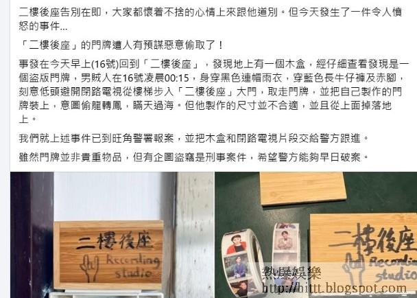 殿堂級樂隊Beyond專屬Band房「二樓後座」錄音室,即將面臨清拆,近日不少歌迷到場,向「二樓後座」道別,緬懷及留念。昨晨(16日)職員返回上址時,發現門口地上有一個木牌,經仔細查看後發現門鐘上的木門牌被人偷龍轉鳳,將自製木門牌放在門鐘上,企圖掩人耳目,惟自製的木門牌尺寸並不合適,由門鐘上掉落地面。職員已將事件報案處理及在網上貼文公開事件。執法部門表示,案件列作「盜竊」,暫未有人被捕。