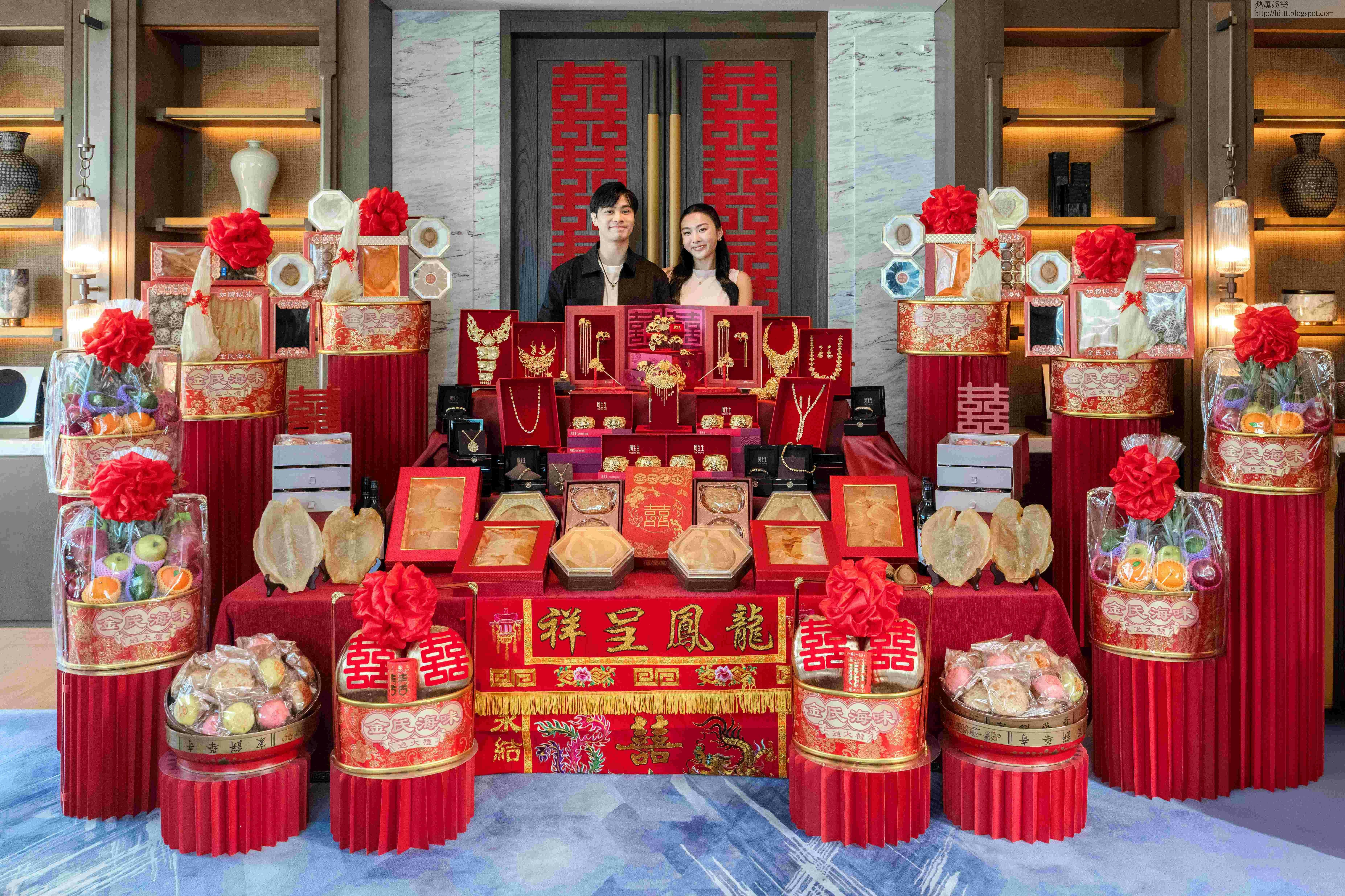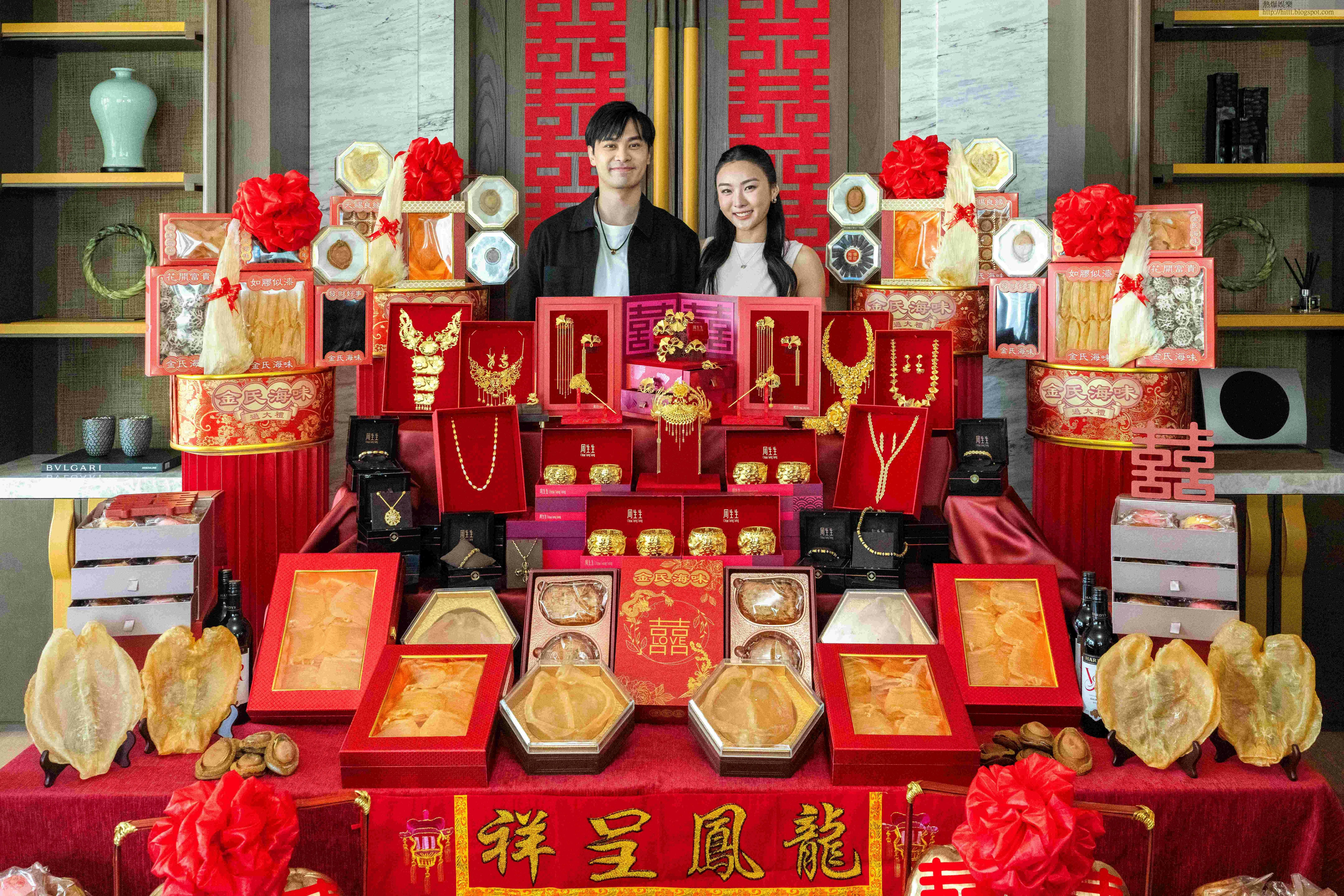 香港女子跳高紀錄保持者楊文蔚(Cecilia)去年宣布喜獲青梅竹馬、拍拖12年牙醫男友孔軍凱(Daryl)求婚,兩人準備迎來人生新篇章,共諧連理。Cecilia雖為年青新世代,但對傳統儀式依然格外重視,昨天(8日)與未婚夫及家人進行了隆重的「過大禮」儀式,各式聘禮當中一系列金飾成為矚目焦點,包括四對重磅龍鳳鈪、精緻鳳冠、多條足金頸鍊,與一系列時尚金飾,象徵滿滿祝福。