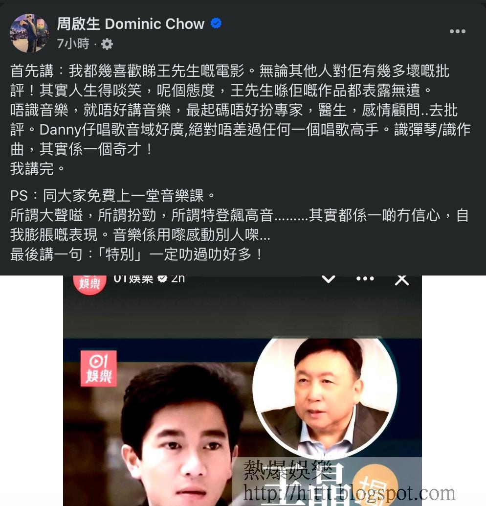 王晶言論一出,立即引起廣泛的回響,其中「樂壇判官」周啟生於社交平台反擊王晶,他指自己其實很欣賞王晶的電影,但對他評價音樂表示不認同,周啟生說:「我都幾喜歡睇王先生嘅電影。無論其他人對佢有幾多壞嘅批評!其實人生得啖笑,呢個態度,王先生喺佢嘅作品都表露無遺。唔識音樂,就唔好講音樂,最起碼唔好扮專家,醫生,感情顧問..去批評。Danny仔唱歌音域好廣,絕對唔差過任何一個唱歌高手。識彈琴/識作曲,其實係一個奇才!我講完。」