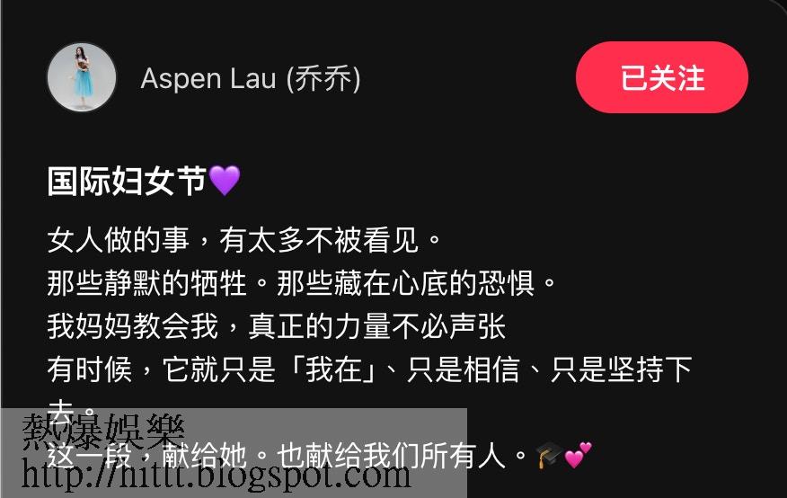 今日是國際婦女節國際婦女節,劉秀盈於社交平台分享與媽咪呂麗君的溫馨合照,並感性發文:「女人做的事,有太多不被看見。那些靜默的犧牲。那些藏在心底的恐懼。我媽媽教會我,真正的力量不必聲張。有時候,它就只是『我在』、只是相信、只是堅持下去。這一段,獻給她。也獻給我們所有人。」相片中,23歲的劉秀盈戴著四方帽、穿上學士袍,長得亭亭玉立,眼大大的她笑容甜美,攬實媽咪呂麗君;而呂麗君則一臉慈愛,頭靠女兒肩部,流露出望女成鳳的自豪感。