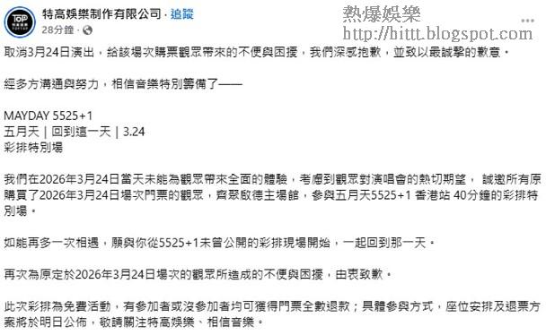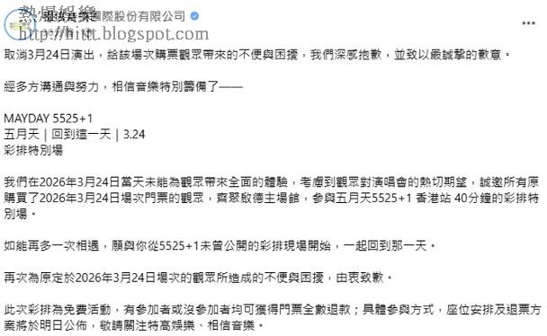 再次為原定於2026年3月24日場次的觀眾所造成的不便與困擾,由衷致歉。