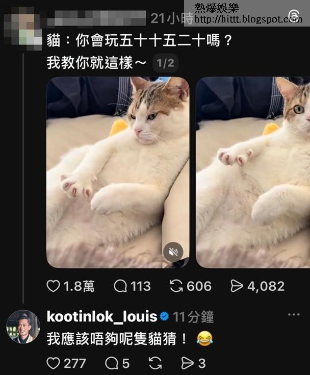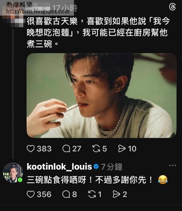 亦有網民Po古仔的昔日劇照,並留言:「很喜歡古天樂,喜歡到如果他說『我今晚想吃泡麵』,我可能已經在廚房幫他煮三碗。」古仔也立即現身留言:「三碗點食得晒呀!不過多謝你先!」更有網民自Po貓咪攤開手板,像猜「十五二十」,並留言:「你會玩五十十五二十嗎?,我教你就這樣!」古仔更亂入搭嗲:「我應該唔夠呢隻貓猜!」令網民驚喜萬分!」