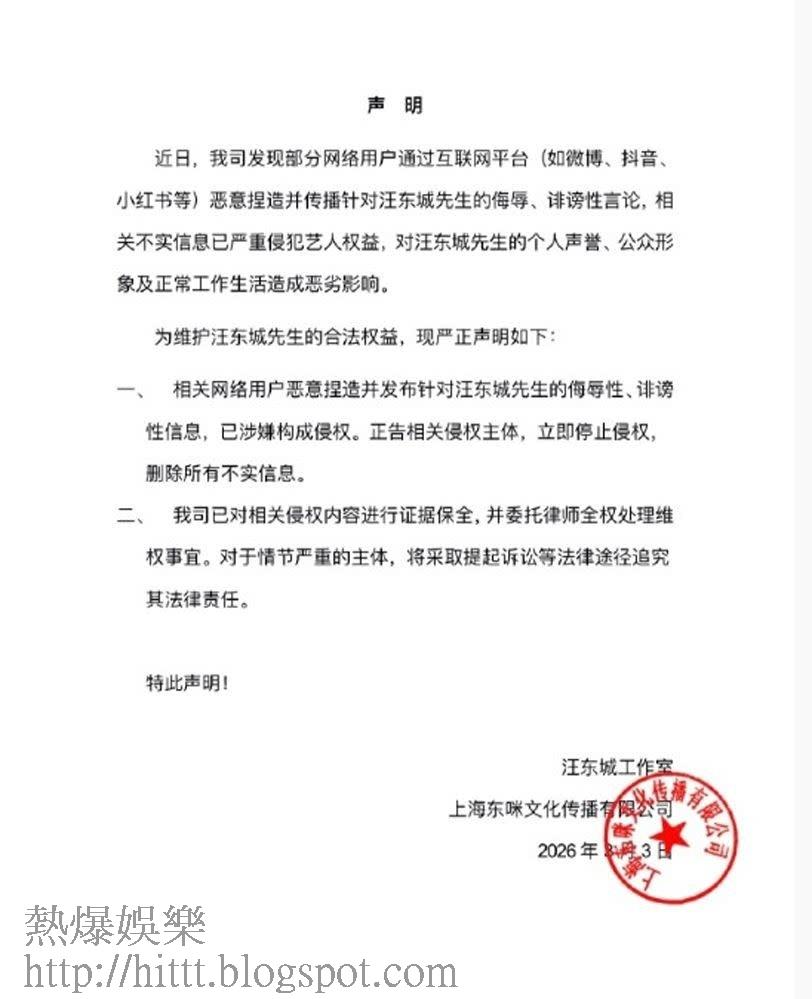 面對輿論的發酵,汪東城工作室早前透過法律途徑作出反擊。聲明中嚴正指出近日發現有部分網絡用戶透過微博、抖音、小紅書等平台,惡意捏造並散播針對汪東城的侮辱性、誹謗性言論,工作室已委託律師全權處理維權事宜。警告相關用戶立即停止侵權並刪除內容,否則將採取法律手段追究到底,試圖徹底終結這段糾纏逾十年的「東綸」紛爭。