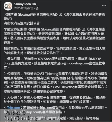 雖然因為火災而取消,但洪卓立社交平台大罵主辦公司Sunny Idea (HK) Limited:「天災人禍絕對冇人想,音樂會取消之後,買咗飛嘅朋友問退款嘅事項點處理就不聞不問冇晒交代,身為主辦係咪應該出嚟交代一下!btw IG都唔見咗。」昨日(8日)即傳出主辦公司已結業,經翻查後,發現主辦公司官方網頁及社交平台帳號已「消失」。主辦公司只剩下Facebook專頁仍存在,但最後一次更新已經是去年12月2日公告許靖韻及洪卓立的演唱會取消。