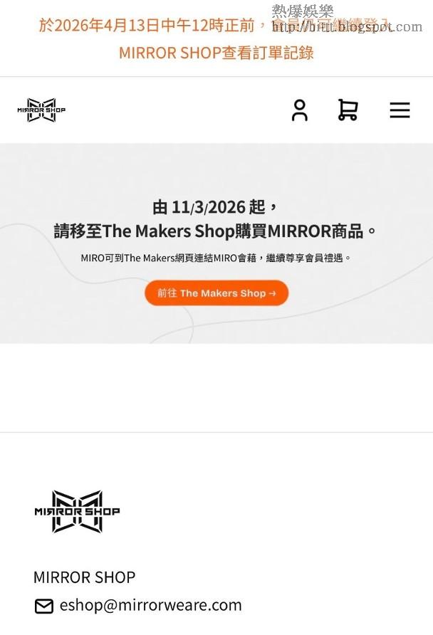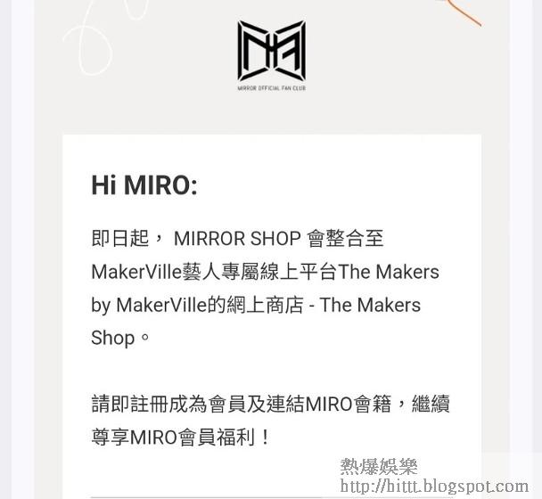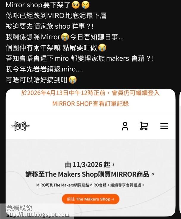 男團MIRROR人氣高企,擁有不少鏡粉,為追偶像她們更不惜每月課金成為MIRO(官方歌迷會成員),除了希望更多機會接觸近距離接觸偶像,亦希望在購買演唱會飛及周邊產品上有優先權,然而事意願違之餘,更經常惹來詬病,令MIRO對公司MakerVille的安排十分不滿,除了持續多時亦難以解決的黃牛問題外,昨日的一則通知更是燃點起眾多MIRO的怒火,紛紛在社交平台發文炮轟公司。事緣多名MIRO在社交平台晒出截圖,圖中是一封來自MIRROR官方歌迷會的電郵,通知MIRO們即日起原先專屬於MIRROR成員的MIRROR SHOP,會整合至MakerVille藝人專屬線上平台The Makers Shop,而原來的MIRROR SHOP網站亦已寫上「由11/3/2026起,請移至The Makers Shop購買MIRROR商品」。