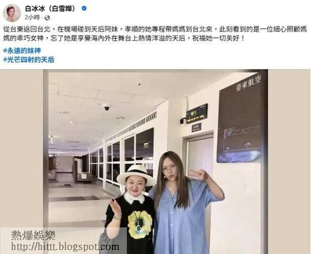 歌手張惠妹(A-mei)近年常回到家鄉台東生活,近期她大多時間留在台東,而資深藝人白冰冰日前在社群平台分享一段在台東機場的巧遇經過,道出了天后最真實一面,令人動容。白冰冰透露當天在機場巧遇張惠妹,才得知對方特地陪媽媽前往台北。她形容當時看到的張惠妹與舞台上充滿氣勢的樂壇天后形象不同,而是一位細心照顧母親的女兒。白冰冰提到,看見張惠妹陪伴母親的模樣,讓她感受到對方溫柔與貼心的一面。