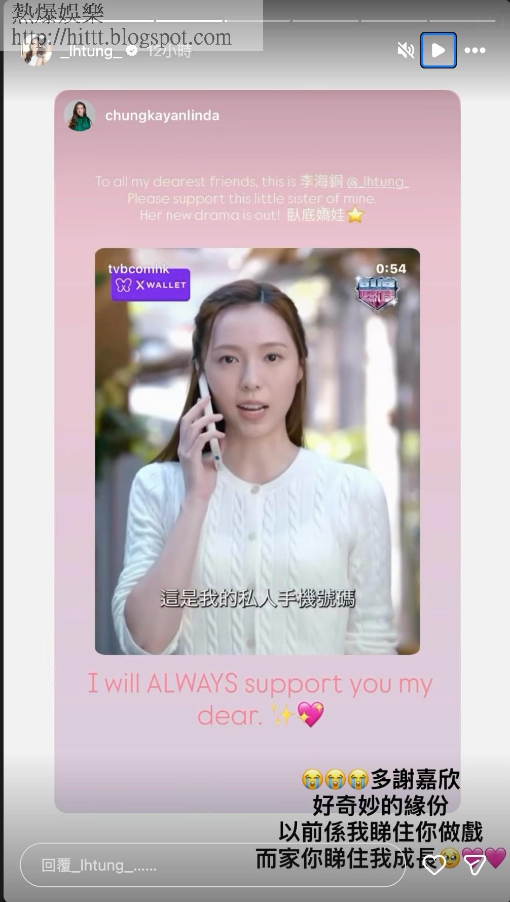 除高海寧外,李海銅更獲視后人馬鍾嘉欣在社交平台出post支持。她用對方的歌《最幸福的事》形容自己心情,「細個嘅時候,嘉欣已經係我嘅偶像,我仲記得穿著校服、背著背囊,要媽咪帶我去商場合照,後來大家都無聯絡,直到前年佢回港,我朋友同佢食飯,我就話可唔可以帶埋我去,我想見一見佢。去到食飯嗰陣,佢竟然認得我,話:『嘩,你以前咁樣㗎咋,而家咁高嘅?』我話我長大咗啦,依家入咗TVB做你師妹。」她大讚鍾嘉欣毫無架子,不但主動Follow她的社交媒體及鼓勵她,還幫她宣傳,令她感到非常幸福,未來希望有機會合作。
