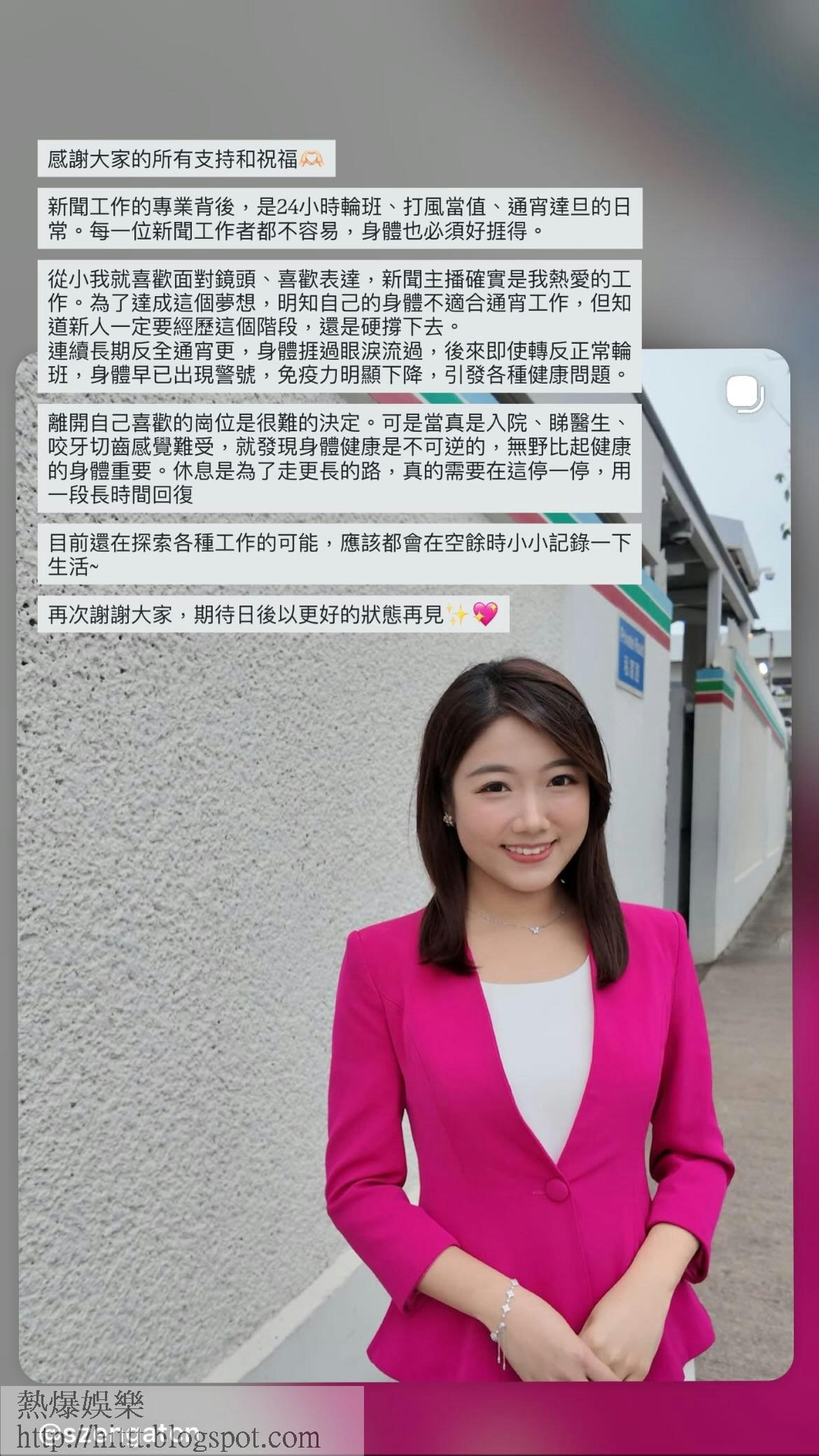 昨日(5日)譚詩雅在社交平台限時動態坦言真正的離職主因。她提到新聞行業需要24小時輪班和通宵工作,而她的身體無法適應這樣的作息安排。她坦率地說:「離開自己喜歡的崗位是很難的決定。明知自己的身體不適合通宵工作,但知道新入一定會經歷這個階段,還是硬撐下去。」雖然她明知身體不適合,但出於對夢想的追求,她仍選擇堅持。最後長期高強度的工作最終讓她無法承受,身體頻頻發出警號。