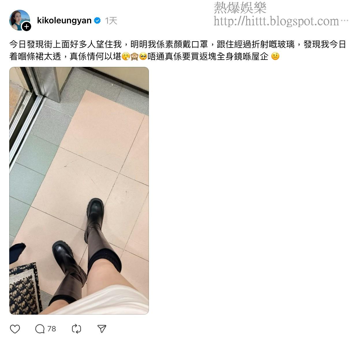 梁茵在Threads發文,上載了一張超短裙配長Boot的照片,並詳細描述走光尷尬經過:「今日發現街上面好多人望住我,明明我係素顏戴口罩,跟住經過折射嘅玻璃,發現我今日着嗰條裙太透,真係情何以堪😮‍💨🙈🥺唔通真係要買返塊全身鏡喺屋企 🤨」。原來梁茵身穿的淺色裙在陽光照射下,竟然近乎完全透視。