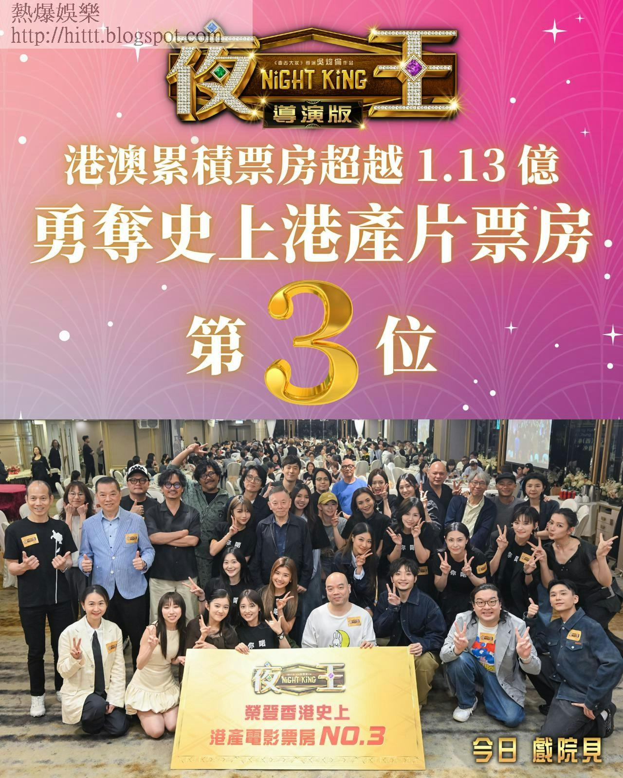 香港夜總會題材賀歲片《夜王》,由吳煒倫導演,黃子華、鄭秀文攜同《毒舌大狀》原班人馬主演,自大年初一(2月17日)上映後受歡迎程度勢不可擋,早前以香港電影史上最快速度打破5000萬元票房紀錄,隨後就順勢破億。而上星期更推出導演版加長30分鐘。來到今日(25/4),電影上映兩個多月,票房登上1.13億,正式登上香港電影票房史上第三位,亦代表黃子華正式稱霸頭三甲。