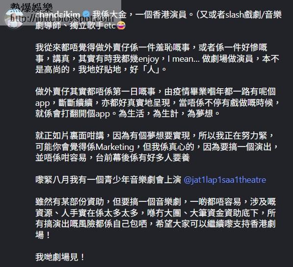 大金隨後在帖文補充,自疫情畢業以來一直有斷斷續續送外賣,從不覺得這是一件羞恥的事,反而認為演員本身就很貼地。她透露8月將籌辦一場青少年音樂劇,寫着:「可能你會覺得係Marketing,但我係真心的,因為要搞一個演出,並唔係咁容易,台前幕後係有好多人要養。」