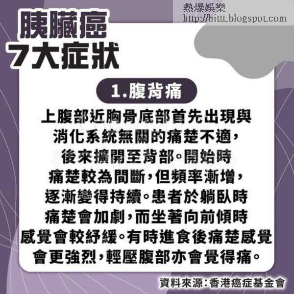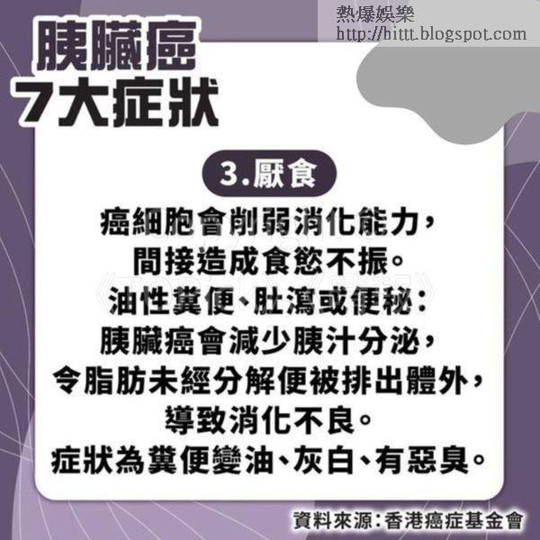 胰臟癌是本港致命癌症的第4位,在2020年導致813人死亡,由於它的症狀不明顯,不容易在早期察覺,且治癒率相當低,因此亦有「癌王」的稱號。據香港癌症基金會資料顯示,胰臟癌常見的7大症狀如下: